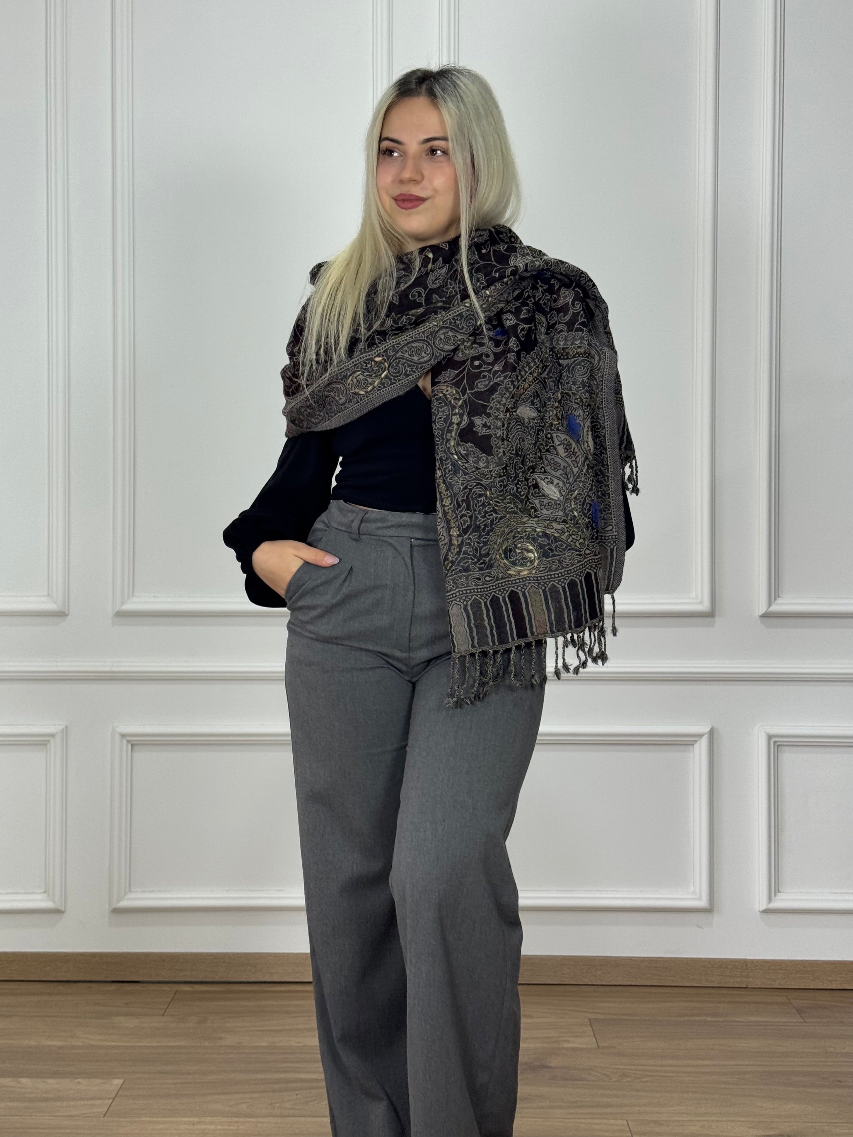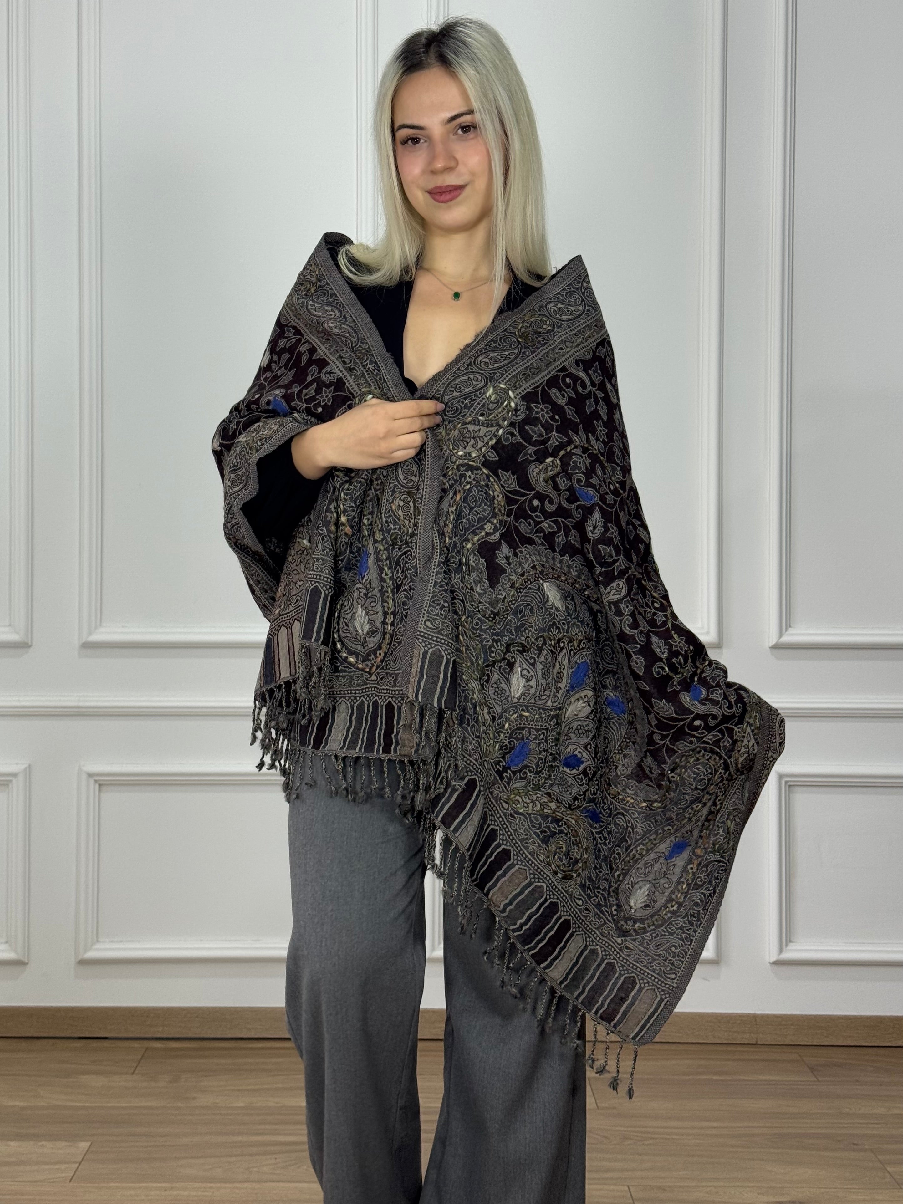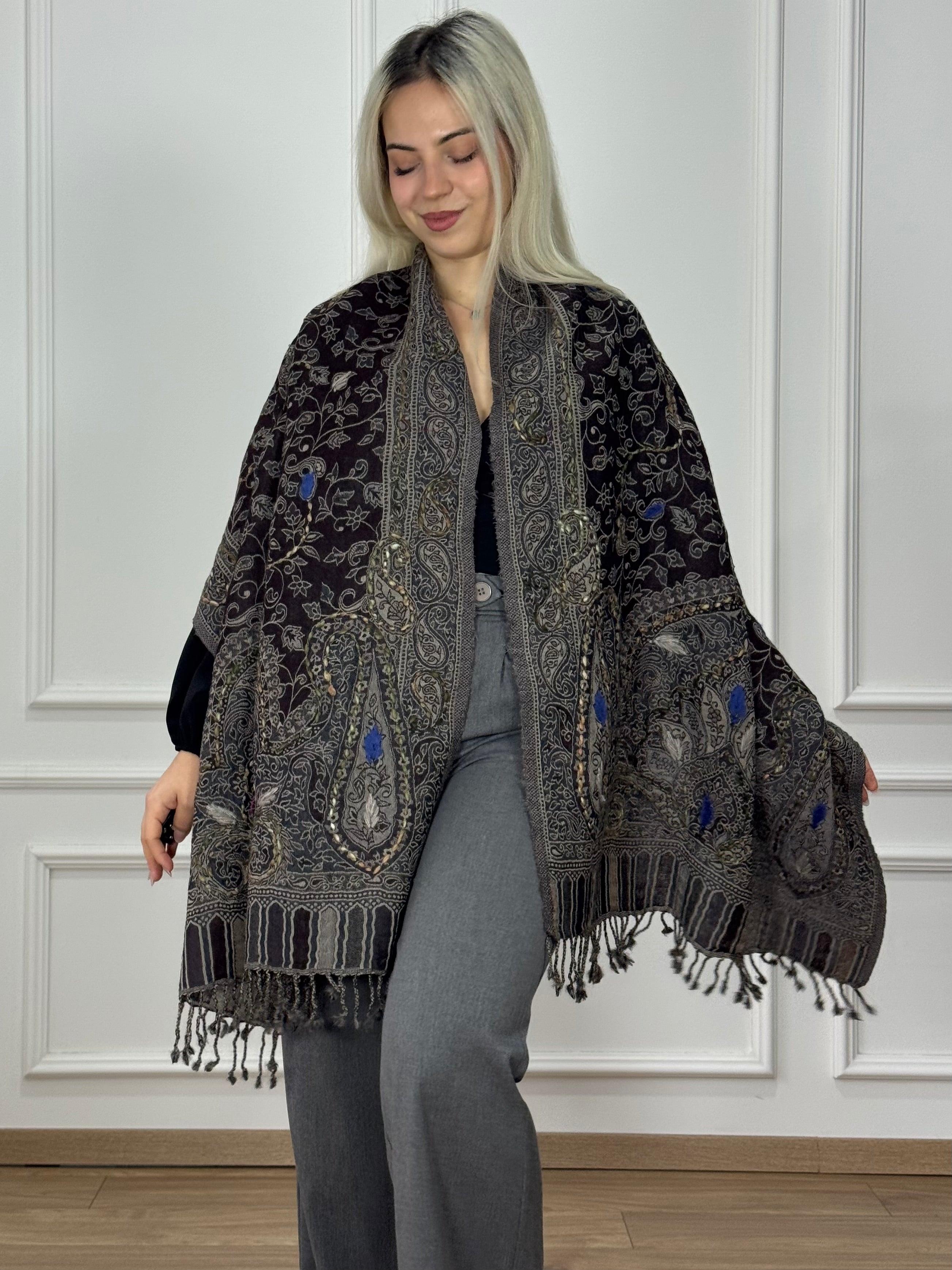 Gyönyörű, kézzel hímzett gyapjú sál, aminek rövidebb végeit rojtok díszítik.