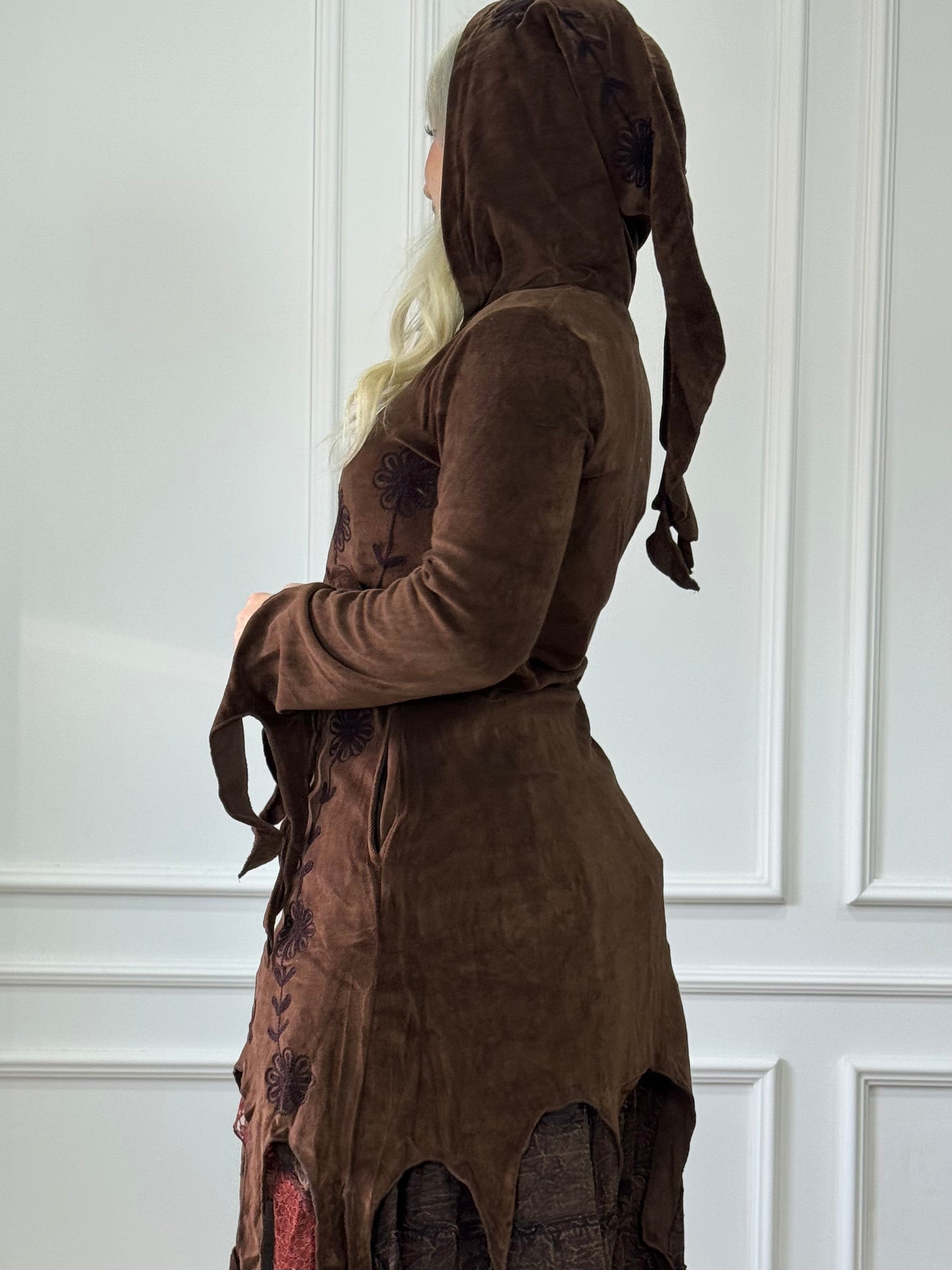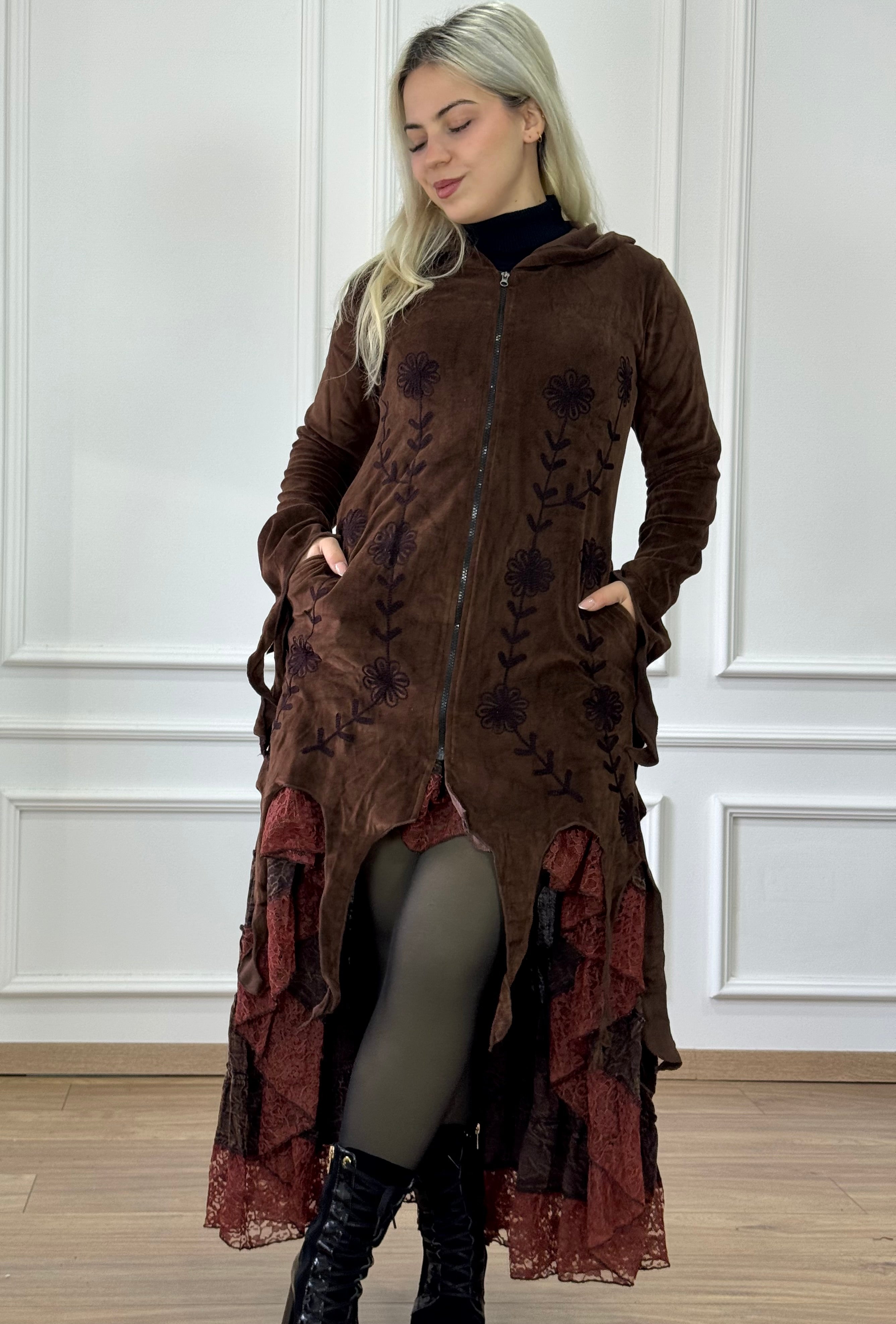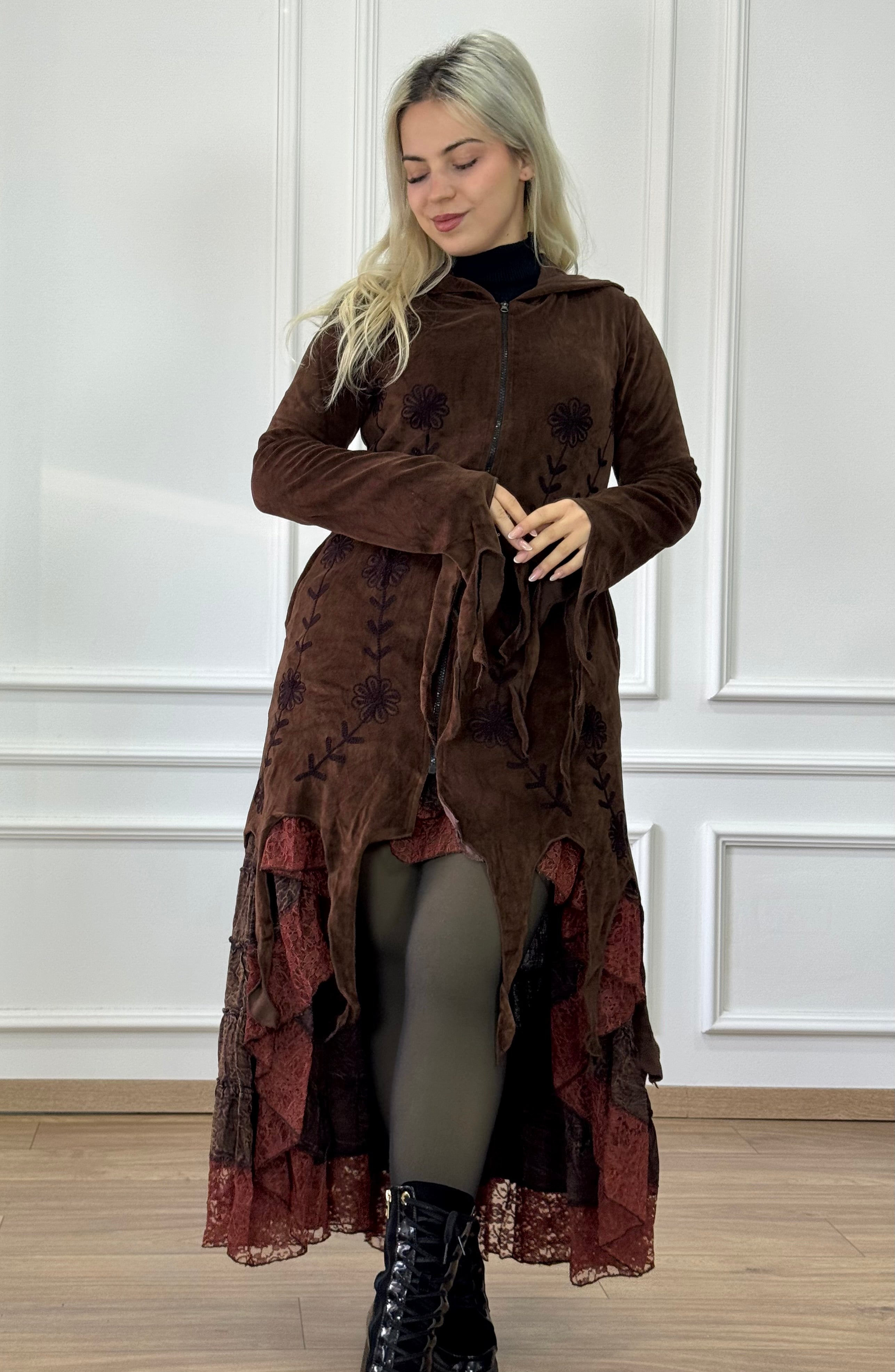 Acest cardigan cu efect de catifea este cu adevărat o piesă specială datorită detaliilor sale: în față și pe mânecă se întind broderii fine și decorative, iar pe gluga cu urechi de elf continuă aceleași motive. La bază, benzile decorative oferă o cădere jucăușă și unică, care face croiala și mai expresivă. Un strat confortabil, dar totodată spectaculos, pentru zilele mai răcoroase.