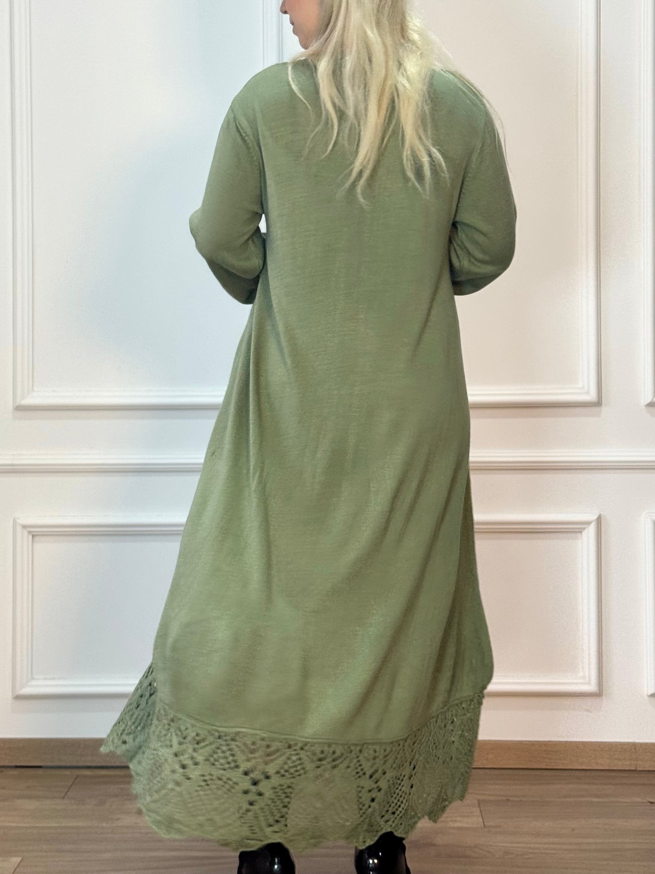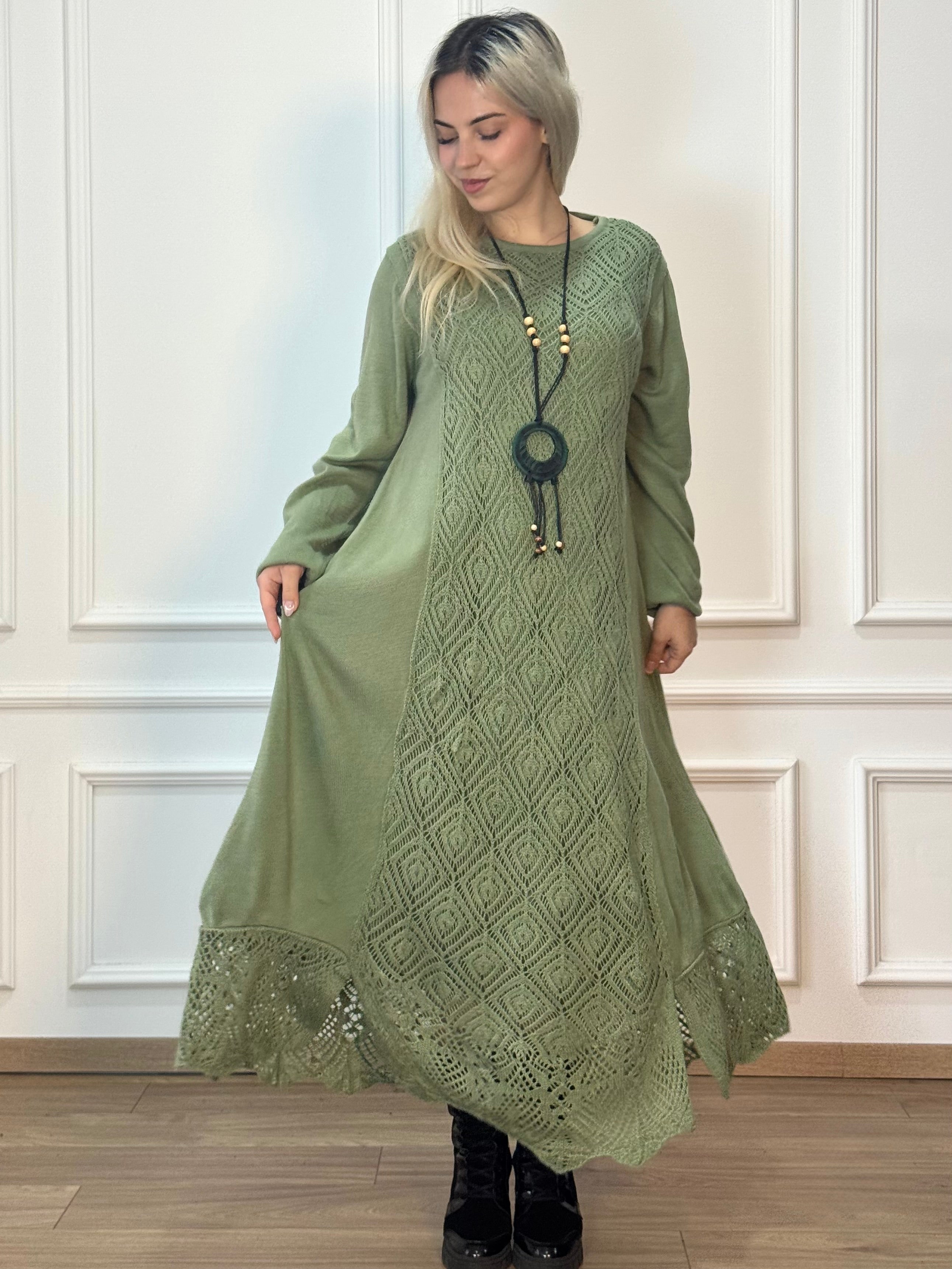 Hosszú, A-vonalú, puha, kötött gyapjúkeverék ruha kerek nyakkal, hosszú ujjal, kötött díszsáv a ruha elején és alján.