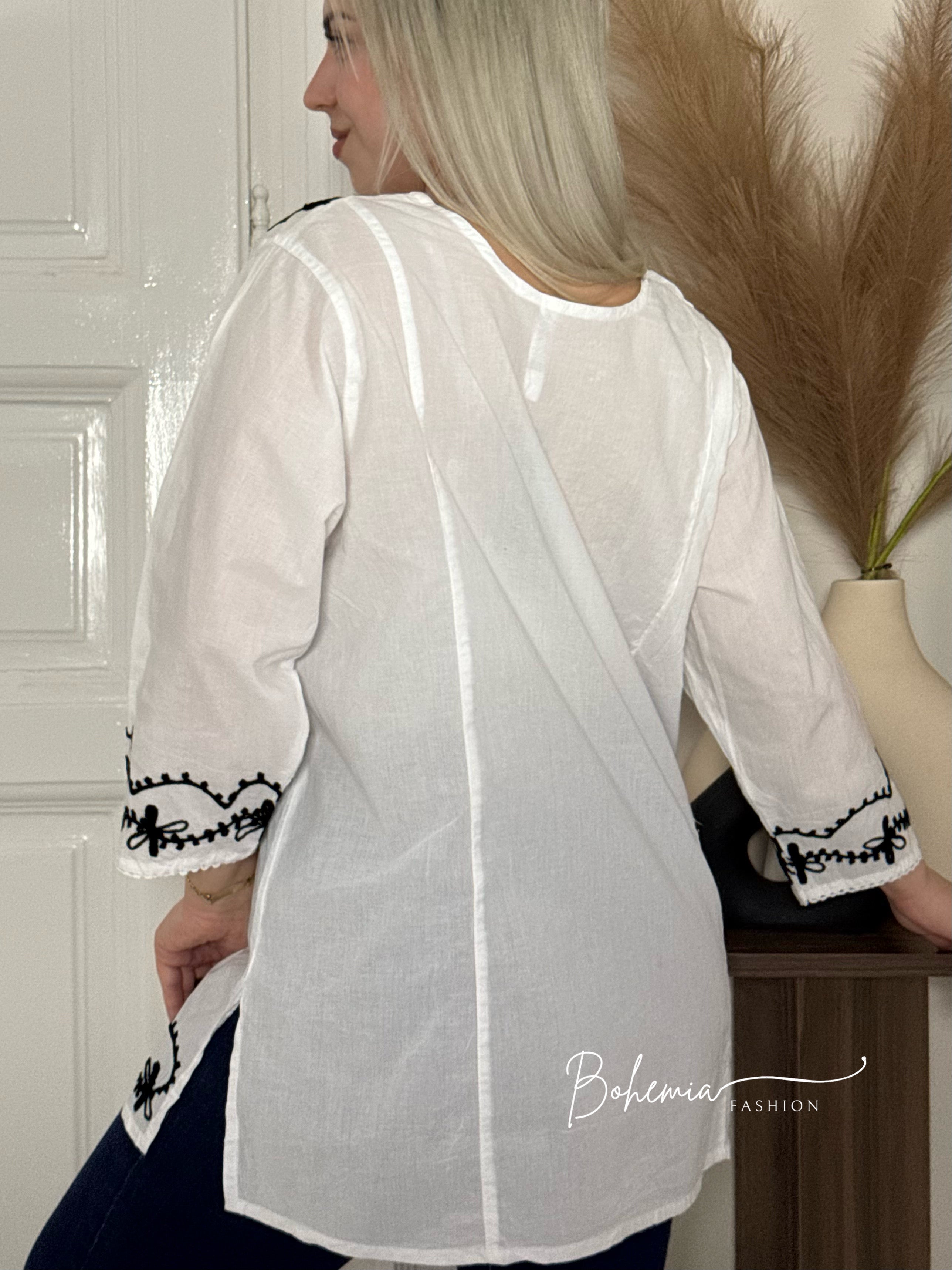 Bluză cu mâneci 3/4, cu model brodat pe piept, la margine și la capetele mânecilor.
