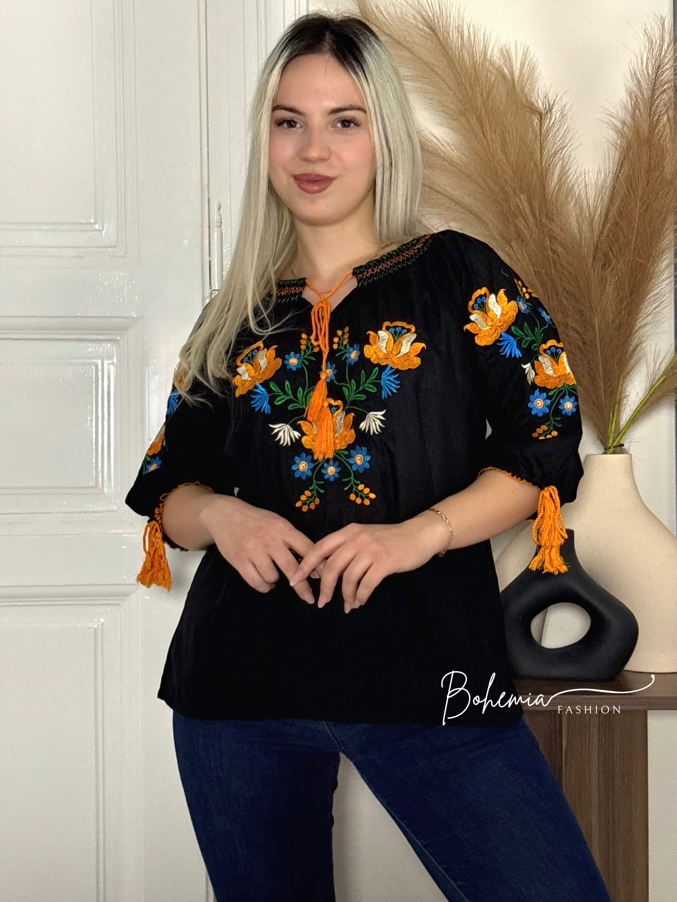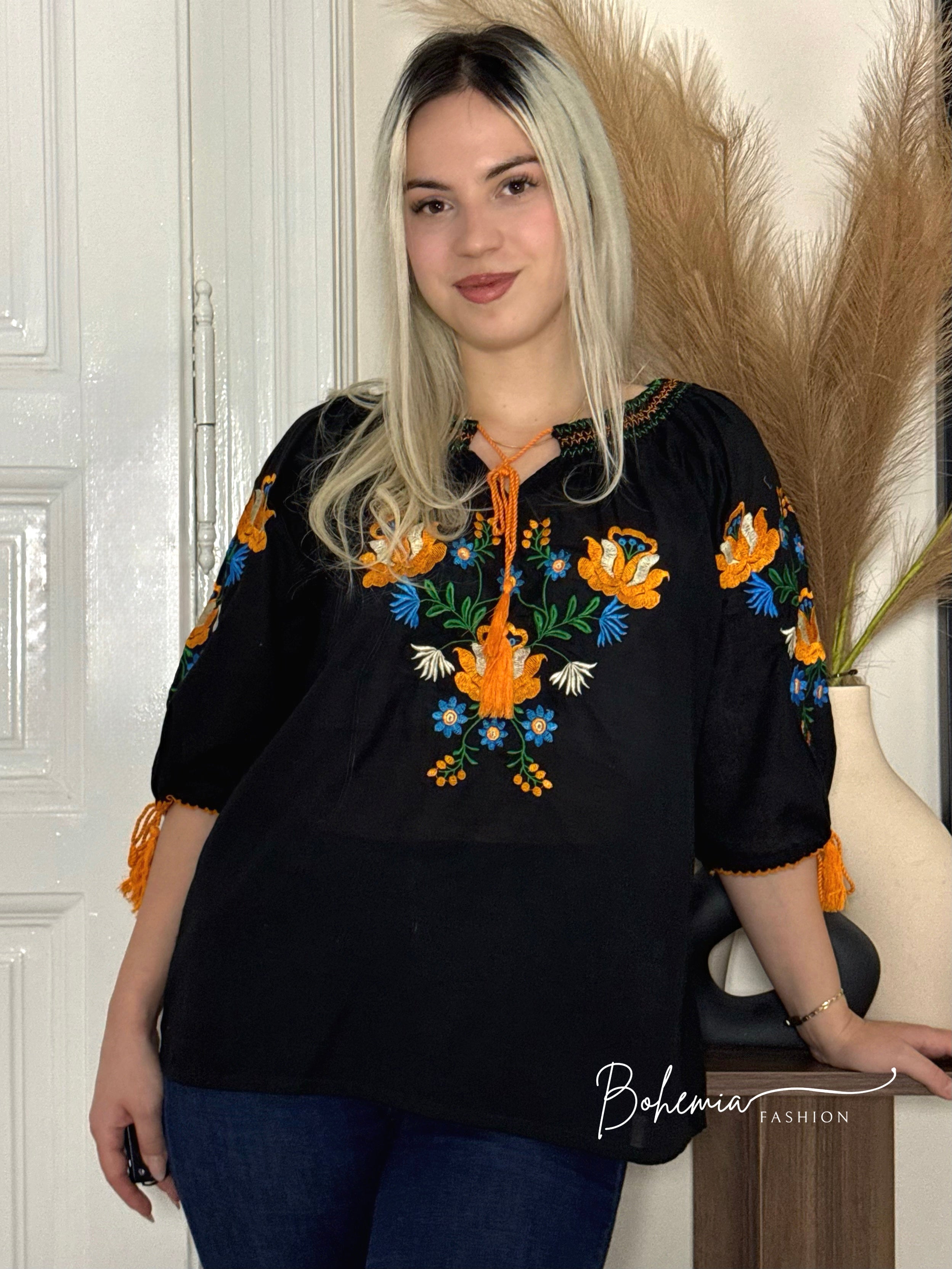 Bluză brodată cu model colorat de flori pe piept și pe mâneci. Datorită șnurului de la capetele mânecilor, poate fi purtată lejer, cu mâneci largi în formă de clopot, sau strânsă la cot, astfel aspectul poate fi ajustat cu ușurință.Un articol versatil, potrivit atât pentru zilele obișnuite, cât și pentru ocazii mai speciale.