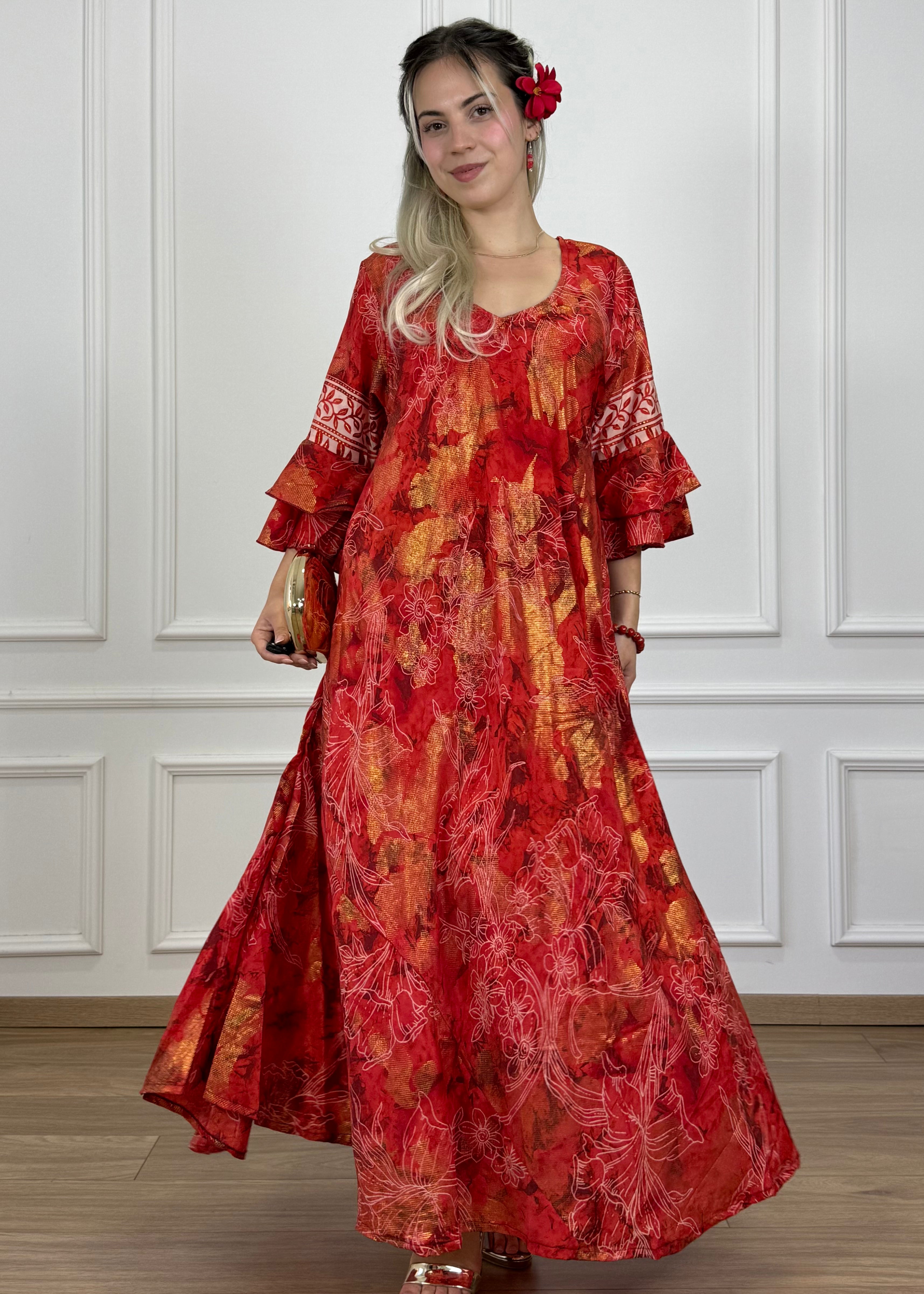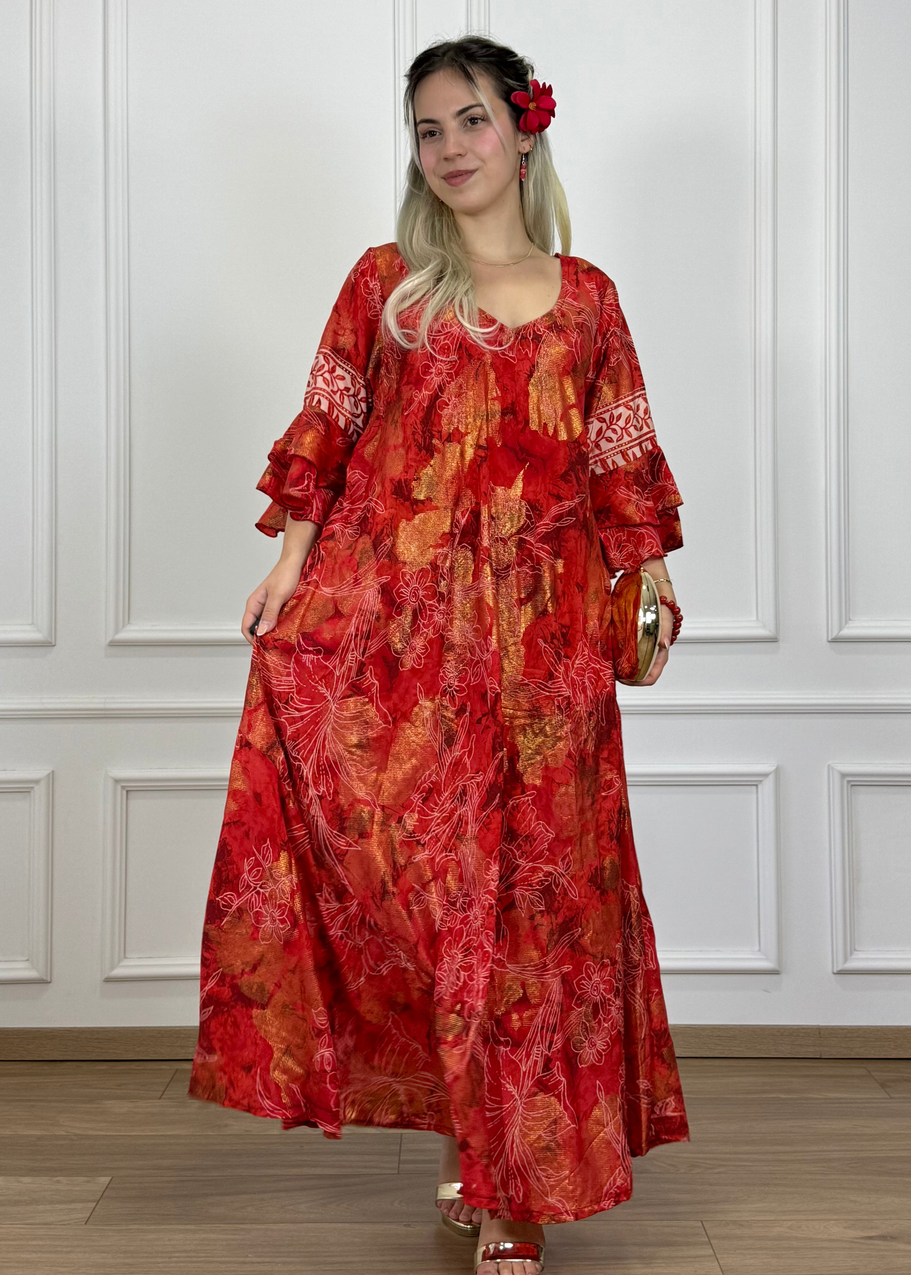 Rochie maxi cu buzunare, croială în formă de A, cu decolteu în V și mâneci trei-sferturi cu volane. Materialul cu aspect mătăsos asigură o cădere lejeră, iar croiala largă o face comodă pentru purtarea zilnică, dar cu o curea poți obține și un efect de subțiere. O croială lejeră, ușor de îndrăgit.