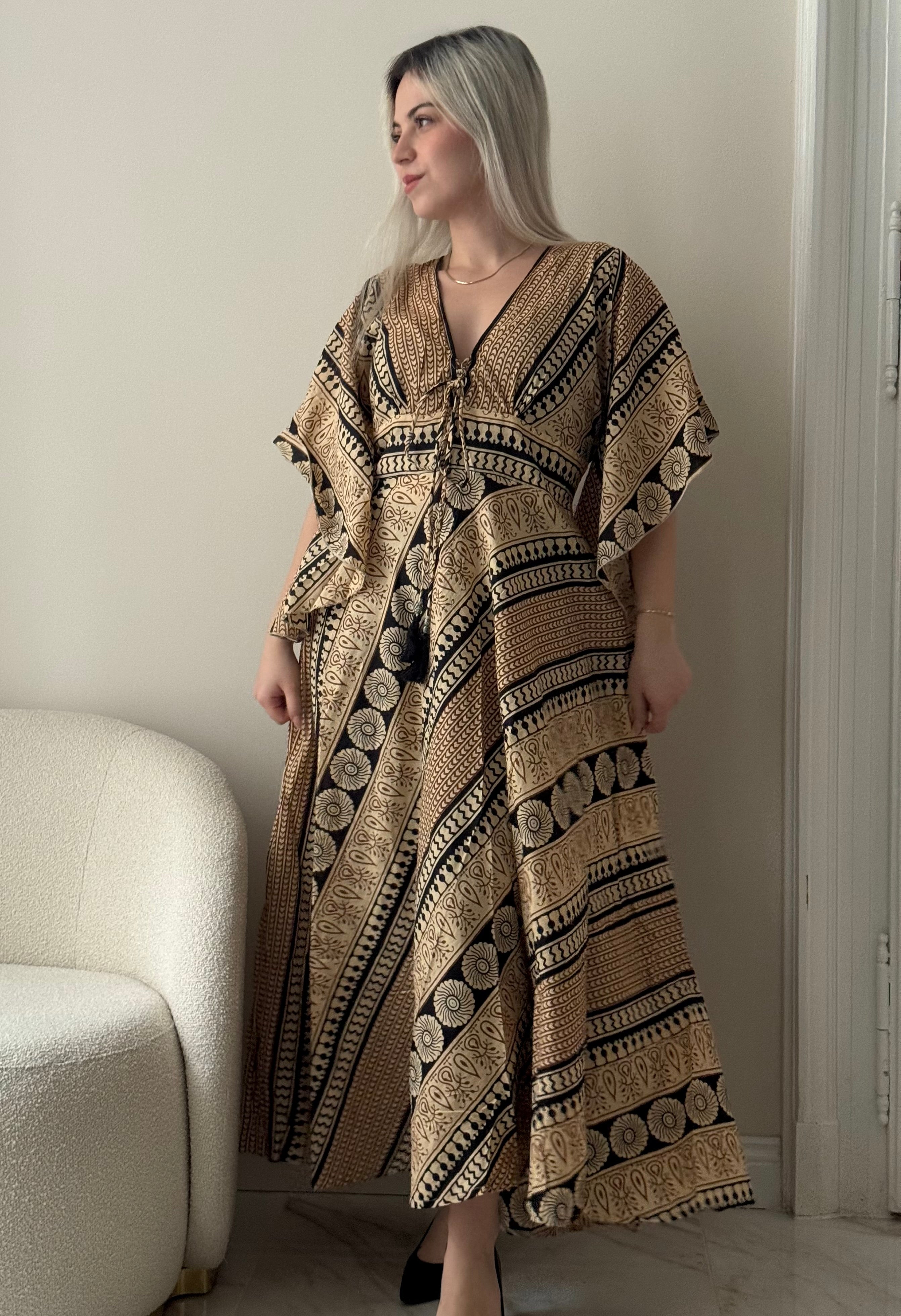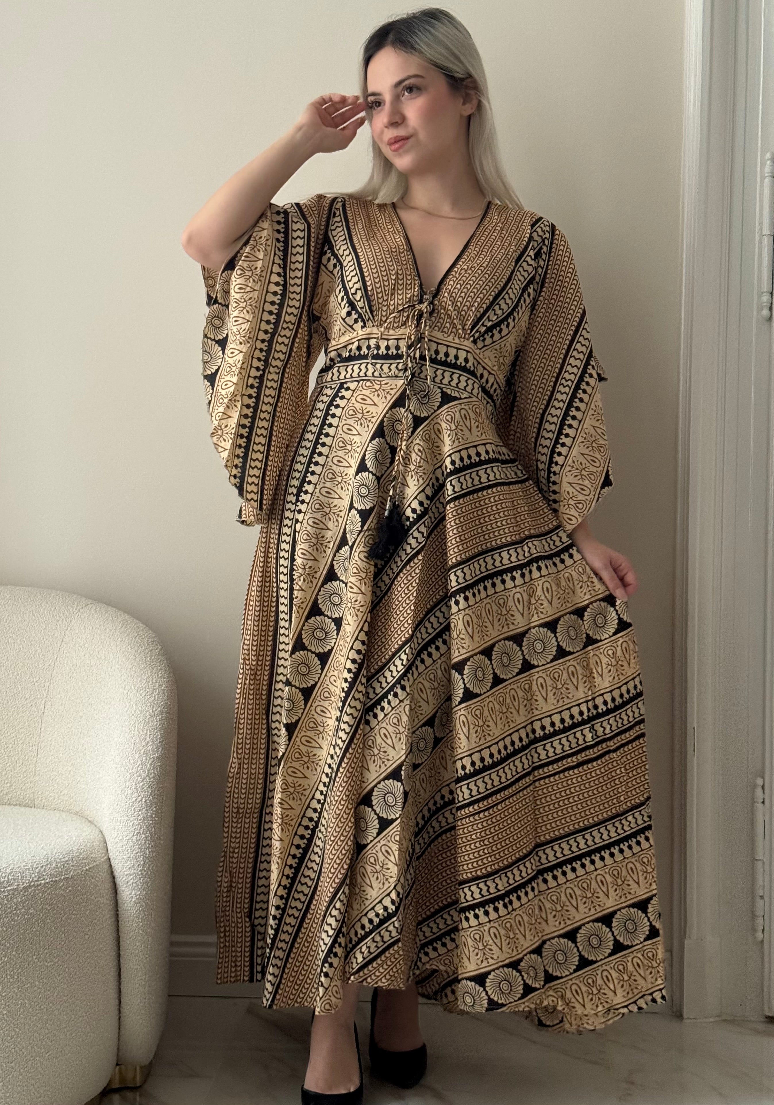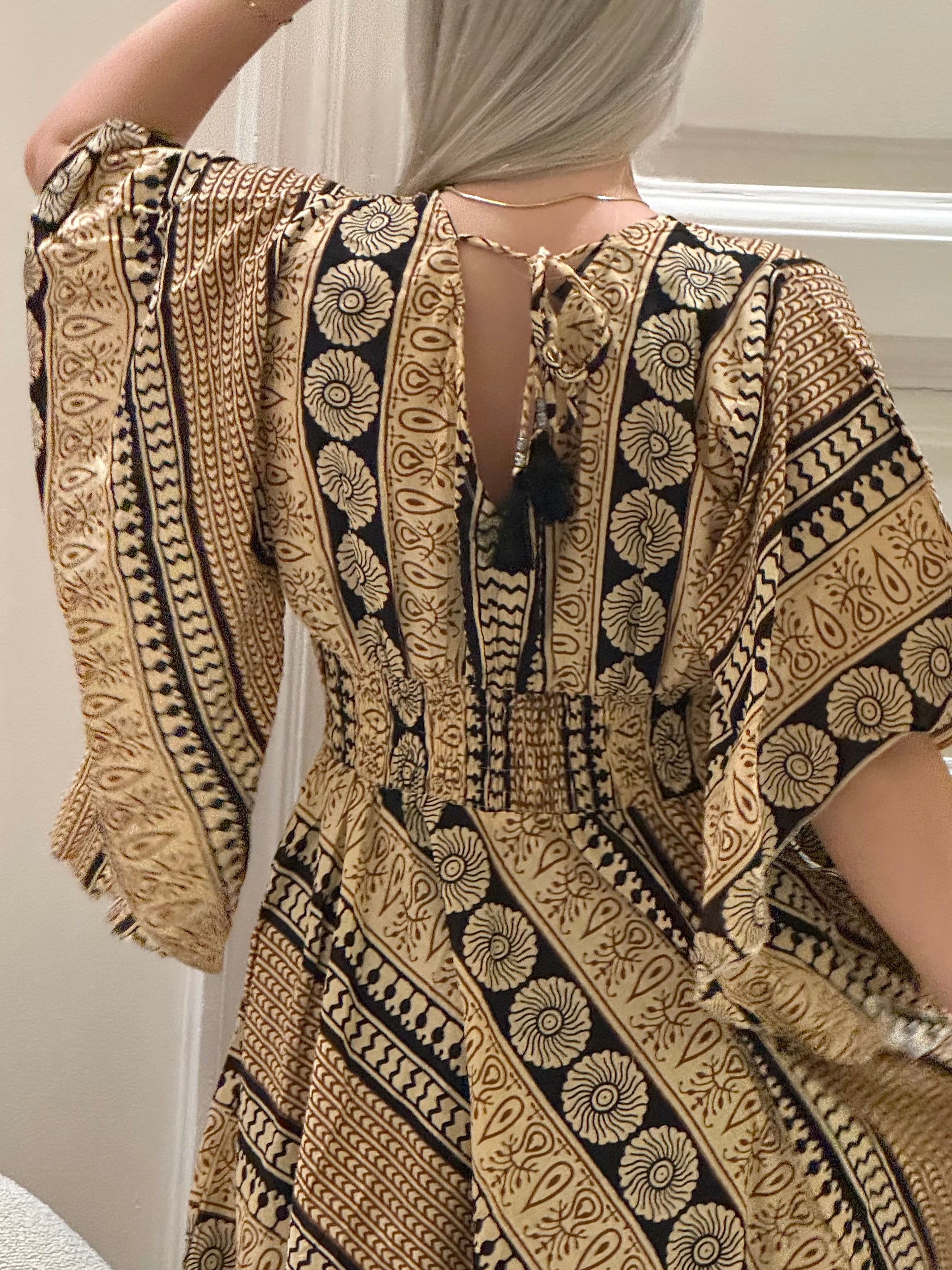 Hosszú, pamut ruha, harangujjakkal, hátul derékban gumis, lefelé bővülő szoknyarész.