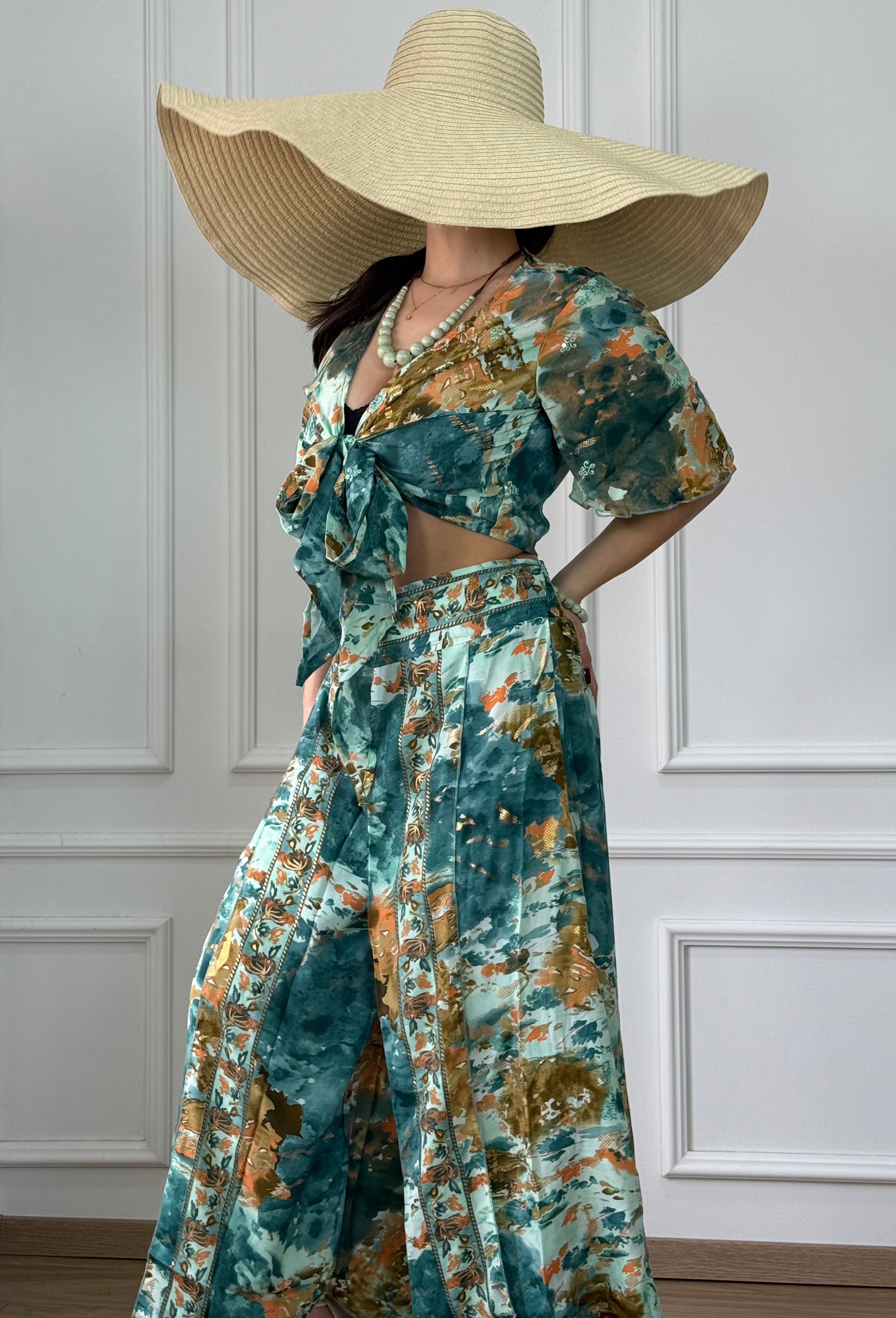 Pantaloni lungi, ușor evazați spre partea de jos, cu talie elastică în spate. Croială cu deschidere laterală până la genunchi, cu suprapunere în față.