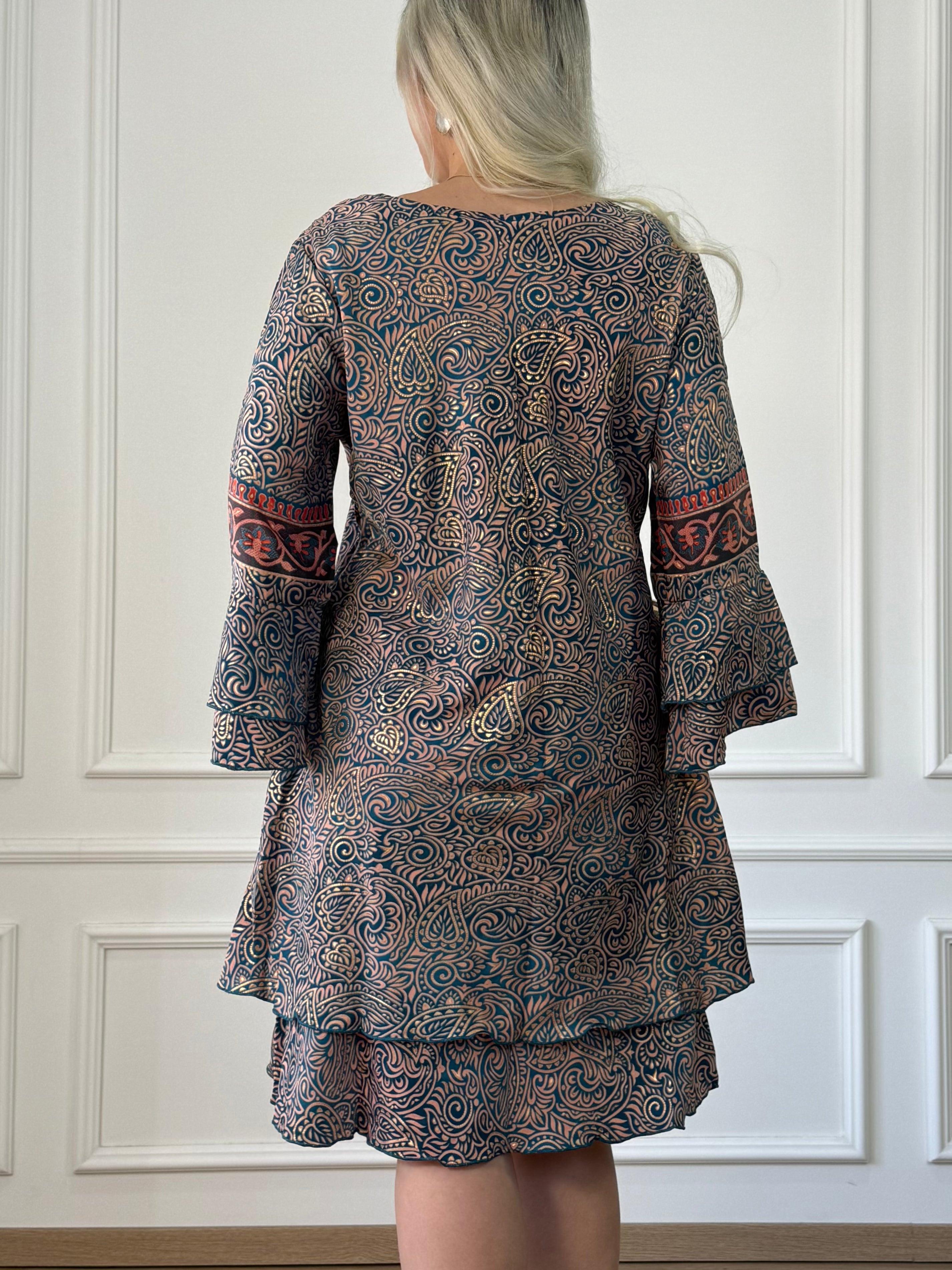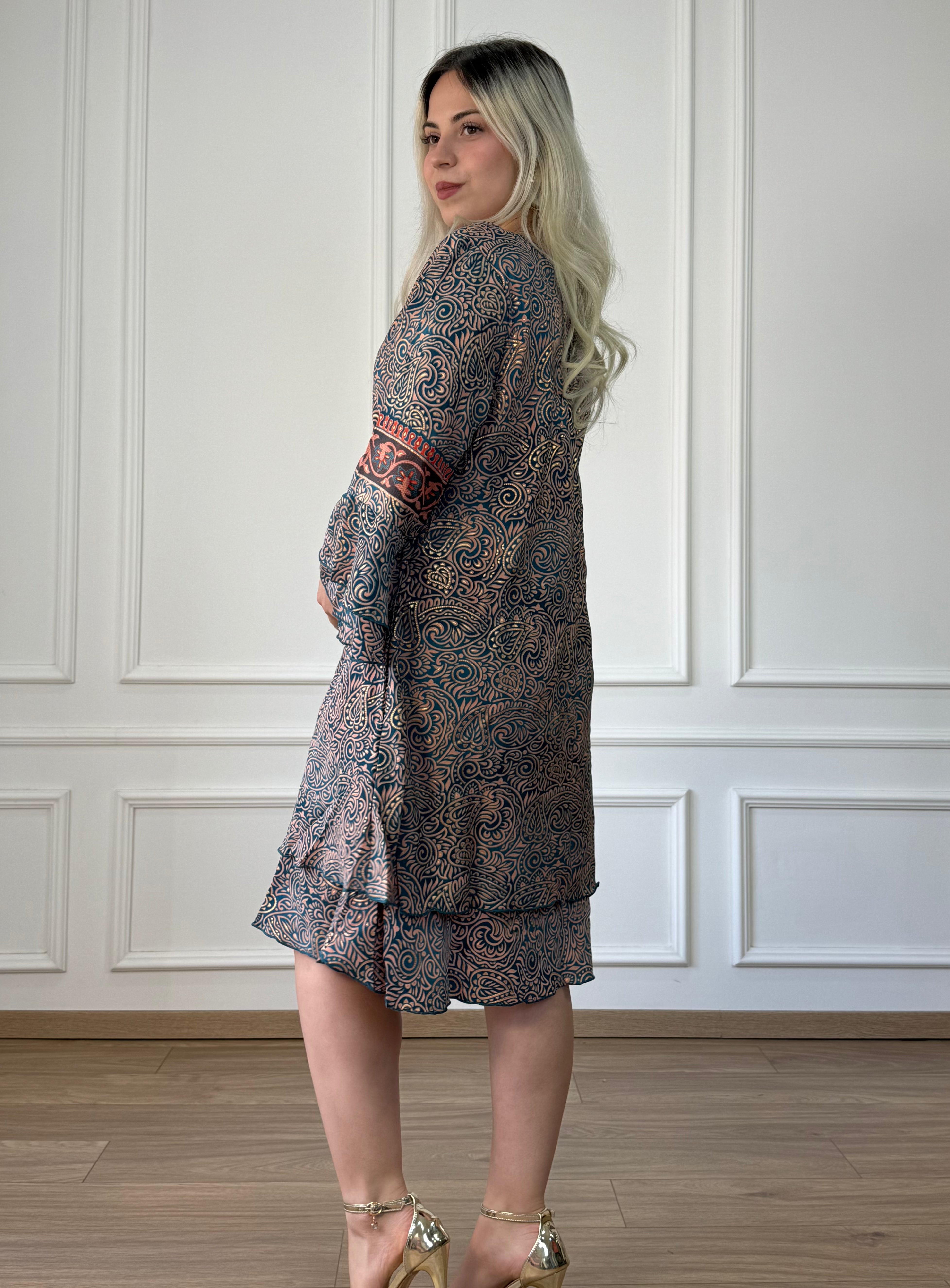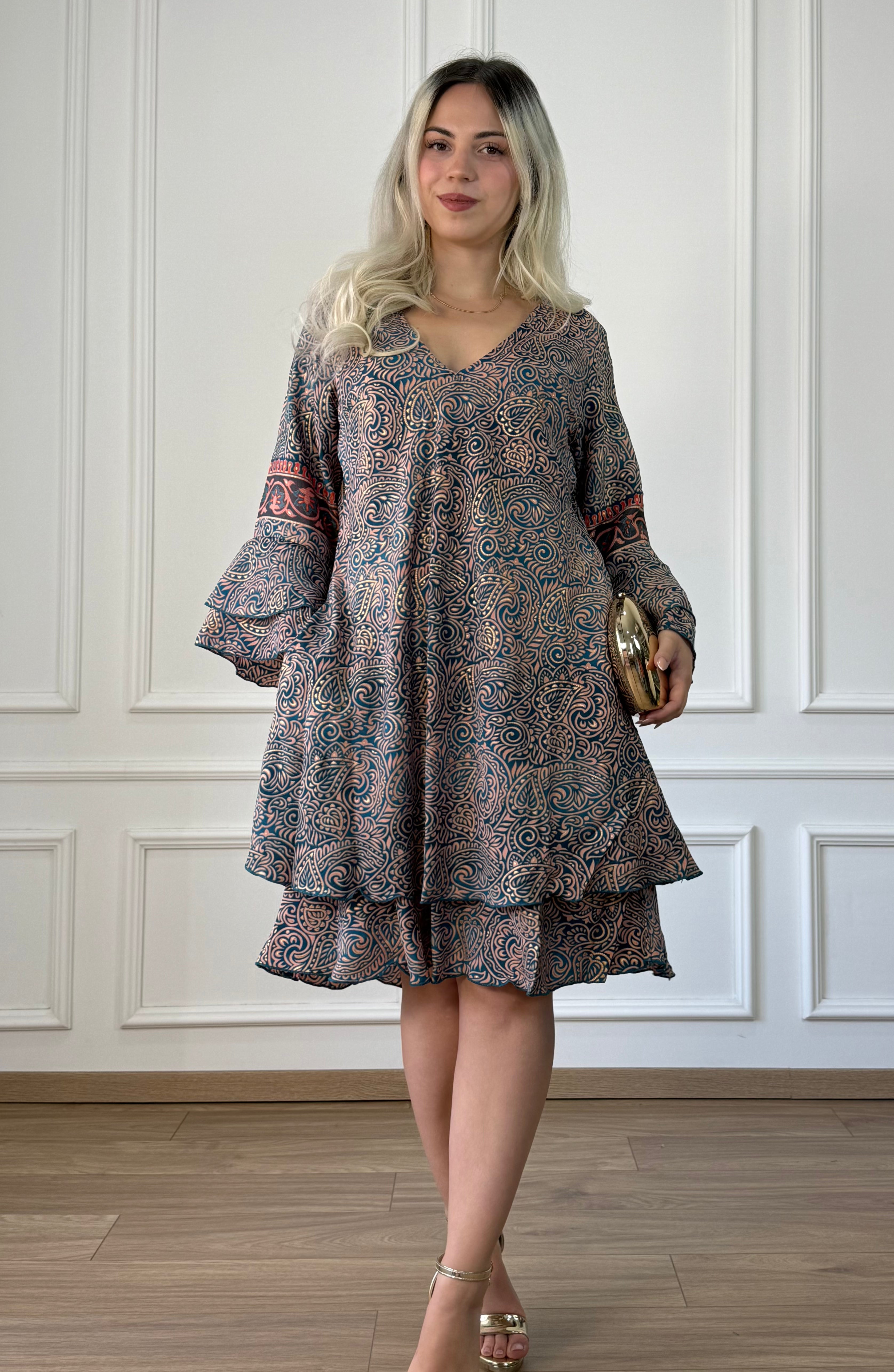 Rochie scurtă cu buzunare, croială în formă de A, cu decolteu în V și mâneci trei-sferturi cu volane. Materialul cu aspect mătăsos oferă o cădere lejeră, iar croiala largă o face comodă pentru purtarea zilnică. Un model lejer, ușor de îndrăgit.