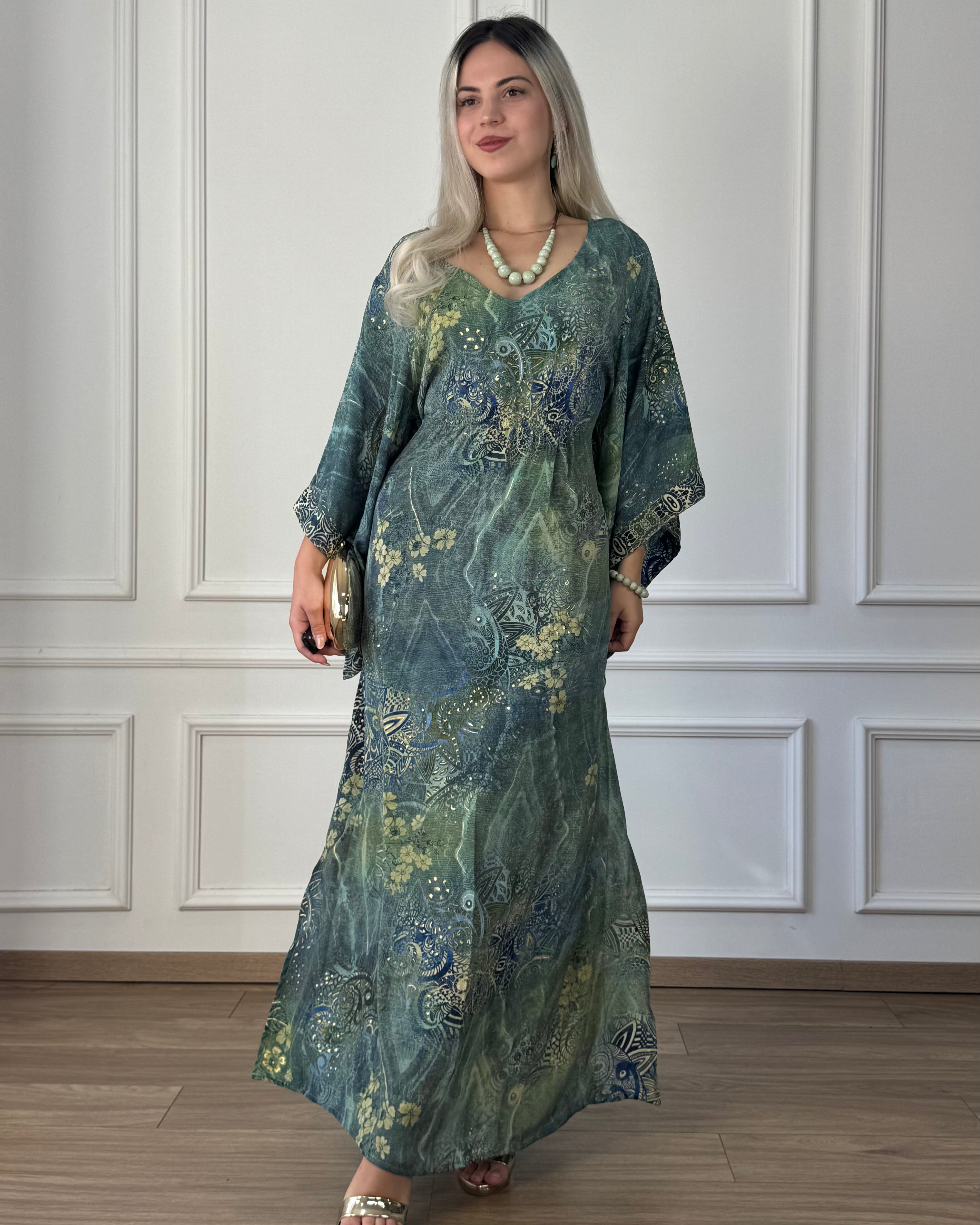 Rochie lungă, cu efect mătăsos, mâneci în croială kimono. Se poate ajusta în talie cu cele două șnururi de pe lateral. Fusta are deschideri pe ambele părți.