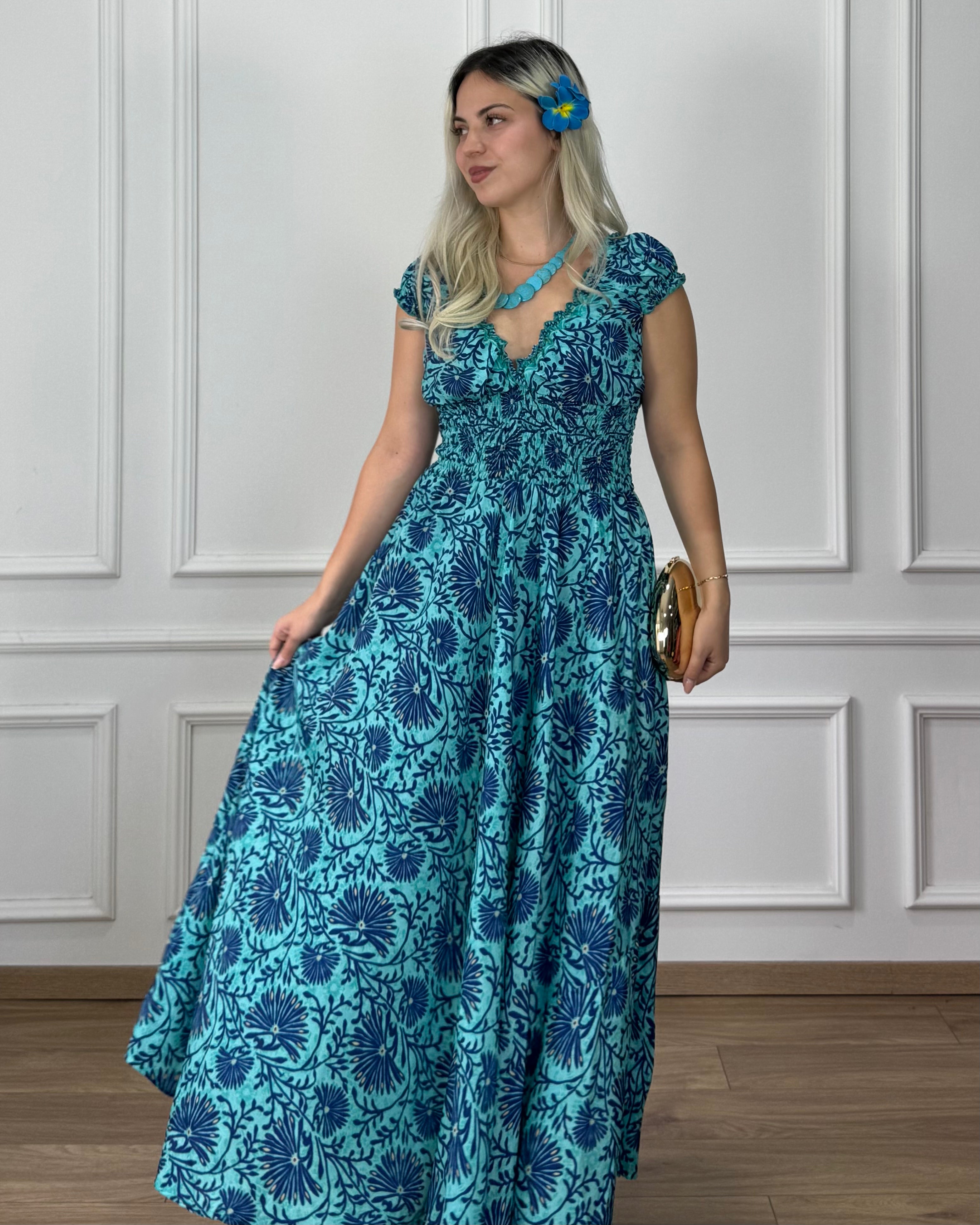 Ein lässiges Maxikleid mit betonter Taille und V-Ausschnitt. Der Stoff verleiht der Trägerin elegante Bewegungsfreiheit, während das elastische Oberteil die Figur harmonisch umspielt. Für einen romantischeren Effekt können die kleinen Ärmel über die Schulter gezogen werden.