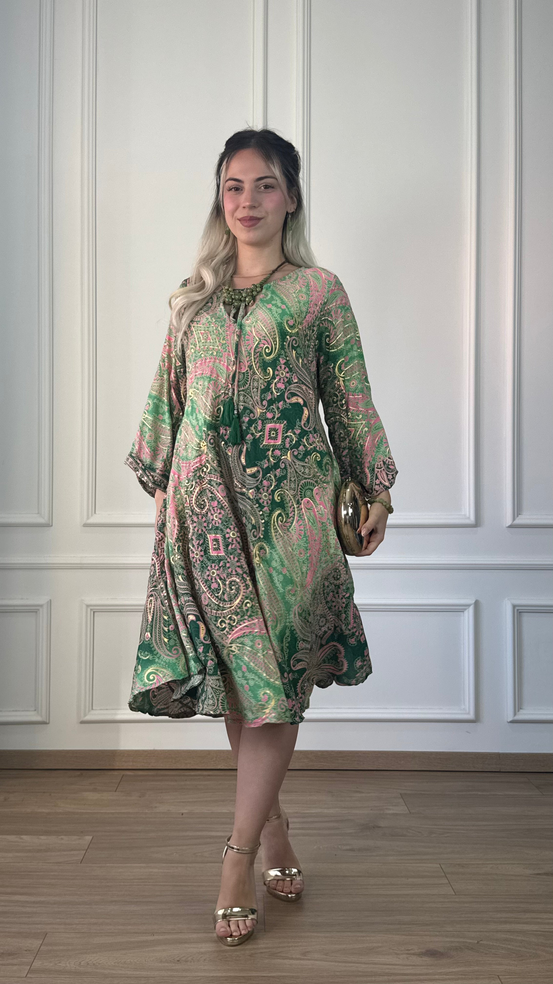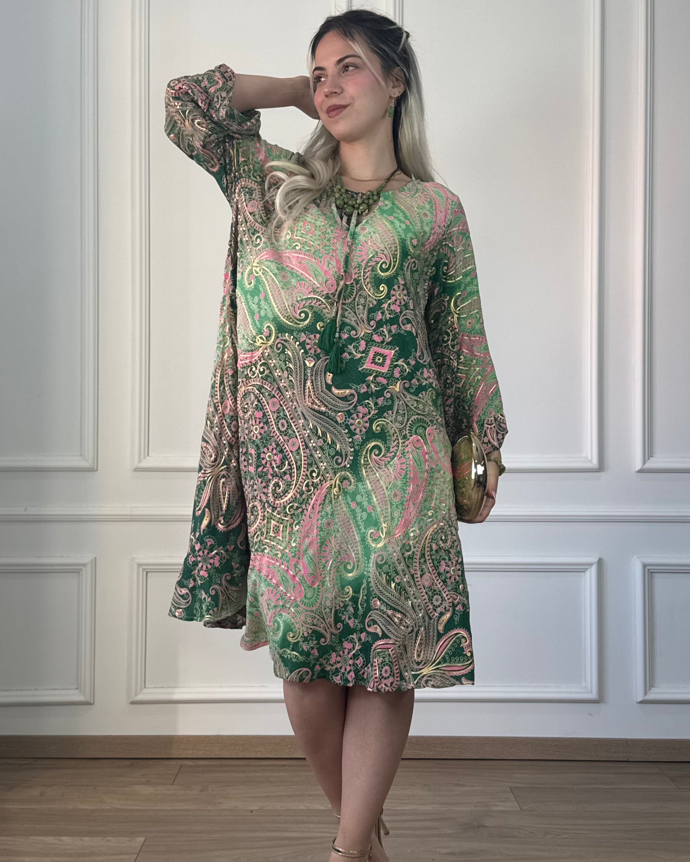 Leichte, locker sitzende Tunika in Seidenoptik mit abgerundetem Saum und zwei dekorativen Bändern an der Brust. Bequeme, lockere Passform. Es kann sowohl als Kleid als auch als Top getragen werden.