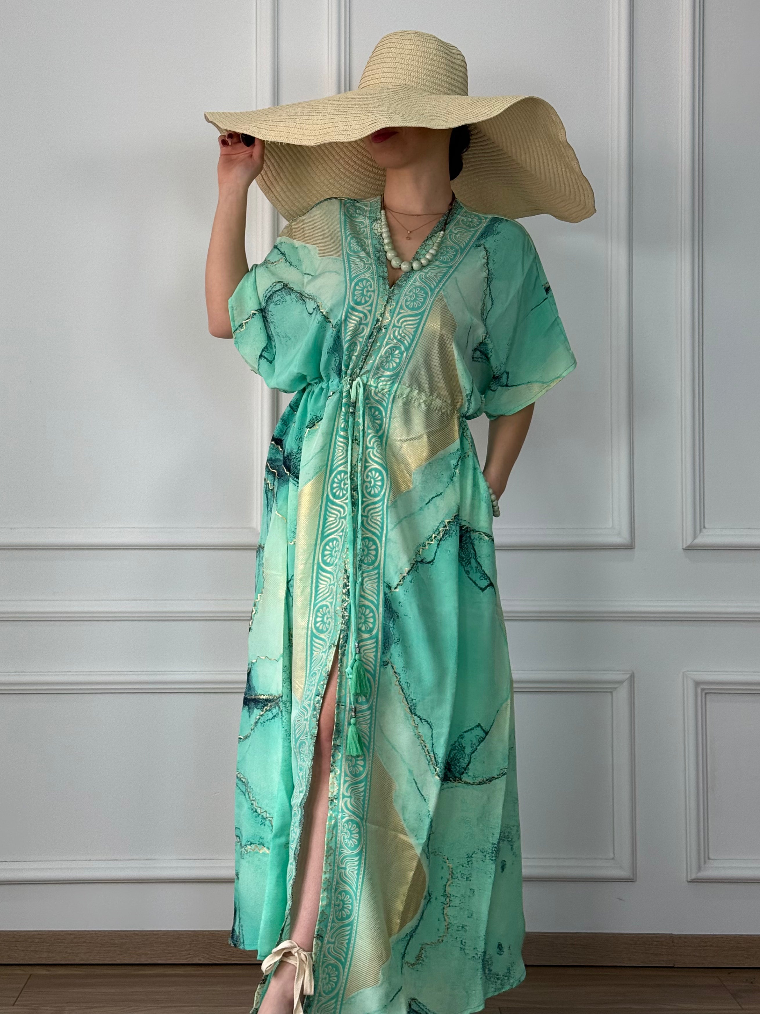 Luftiges und elegantes Maxikleid mit Seideneffekt. Der V-Ausschnitt und die kurzen, weiten Ärmel sorgen für einen femininen Look, während die während das Kordelzugdesign in der Taille die Figur betont. Der offene Frontschnitt sorgt für viel Bewegungsfreiheit und die praktischen Seitentaschen machen den Tragekomfort noch weiter.