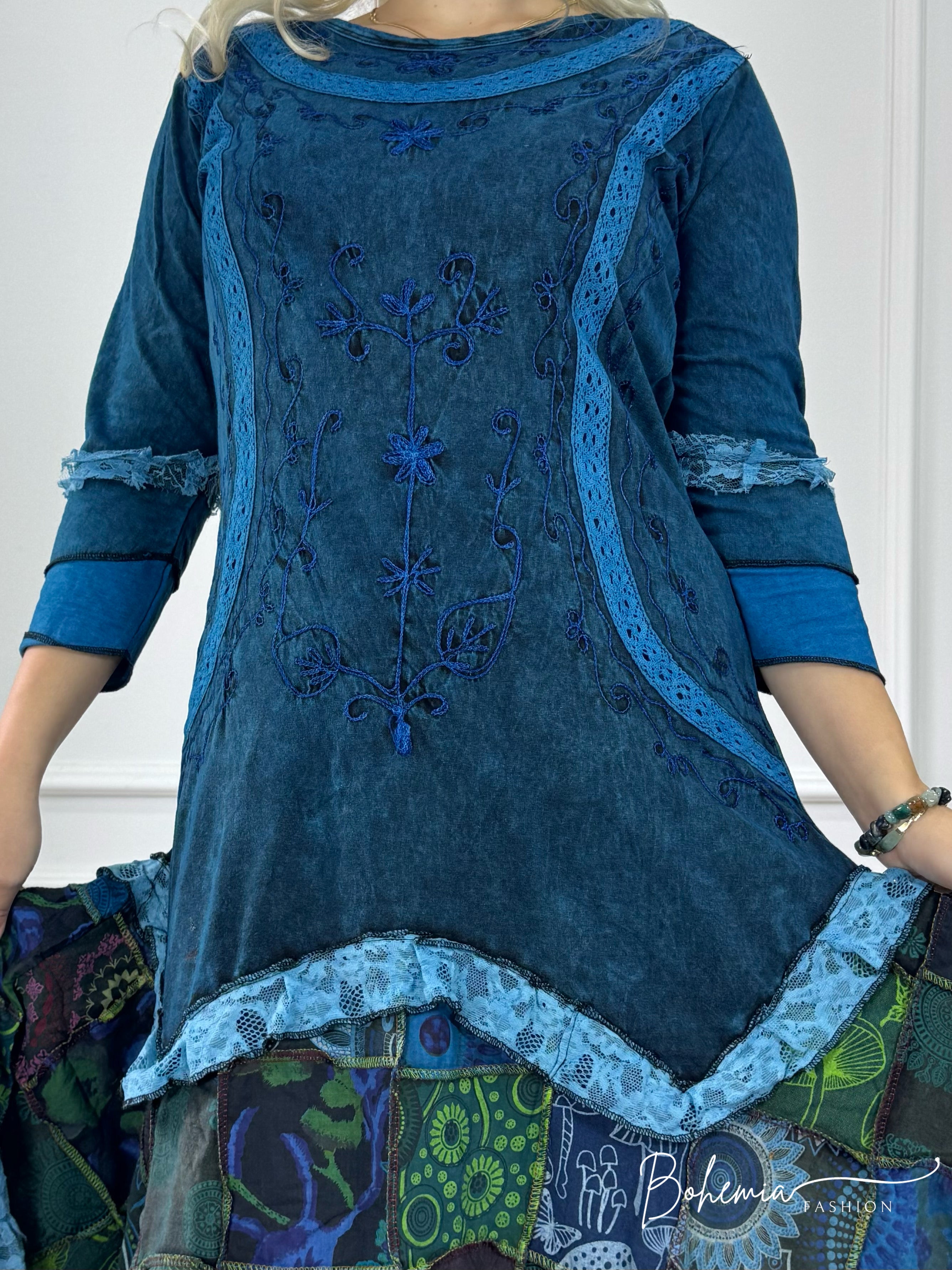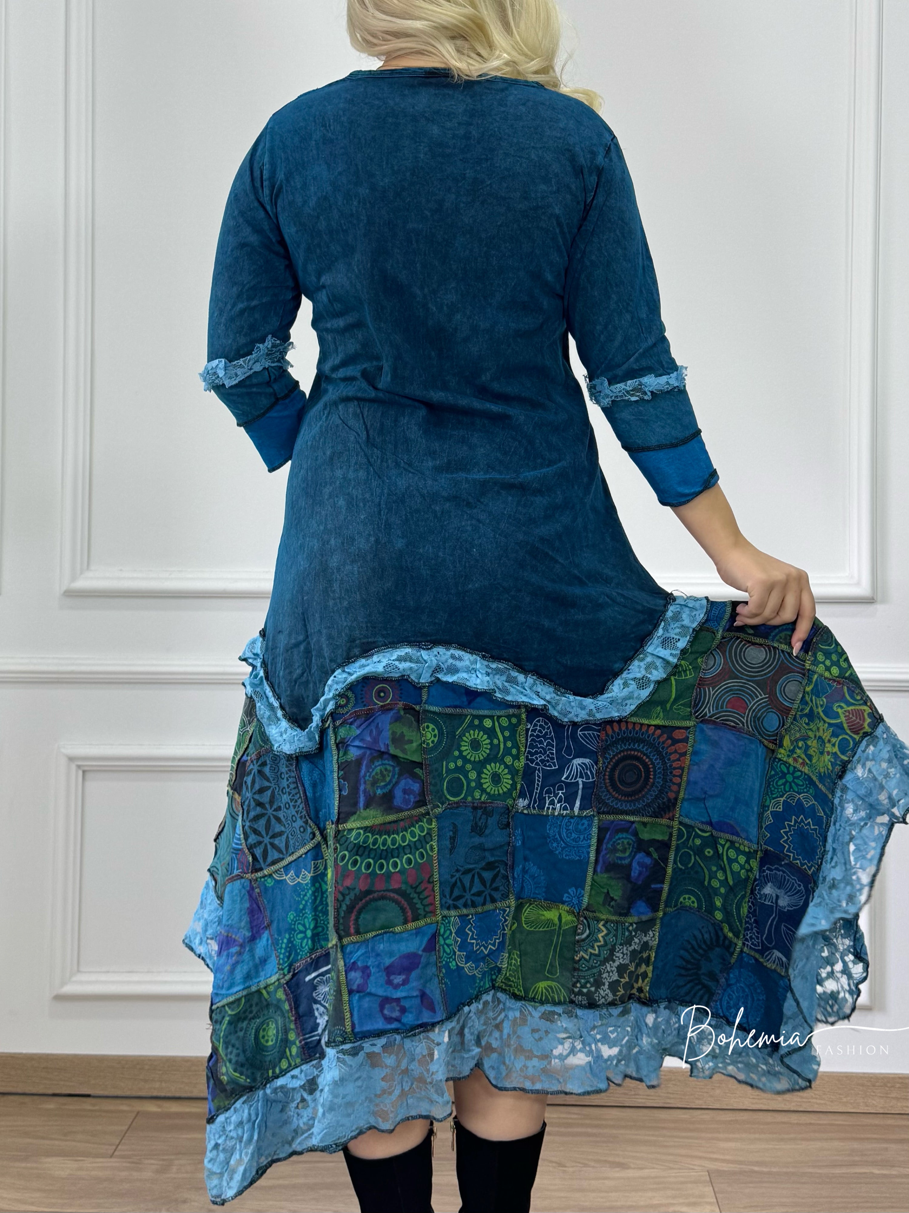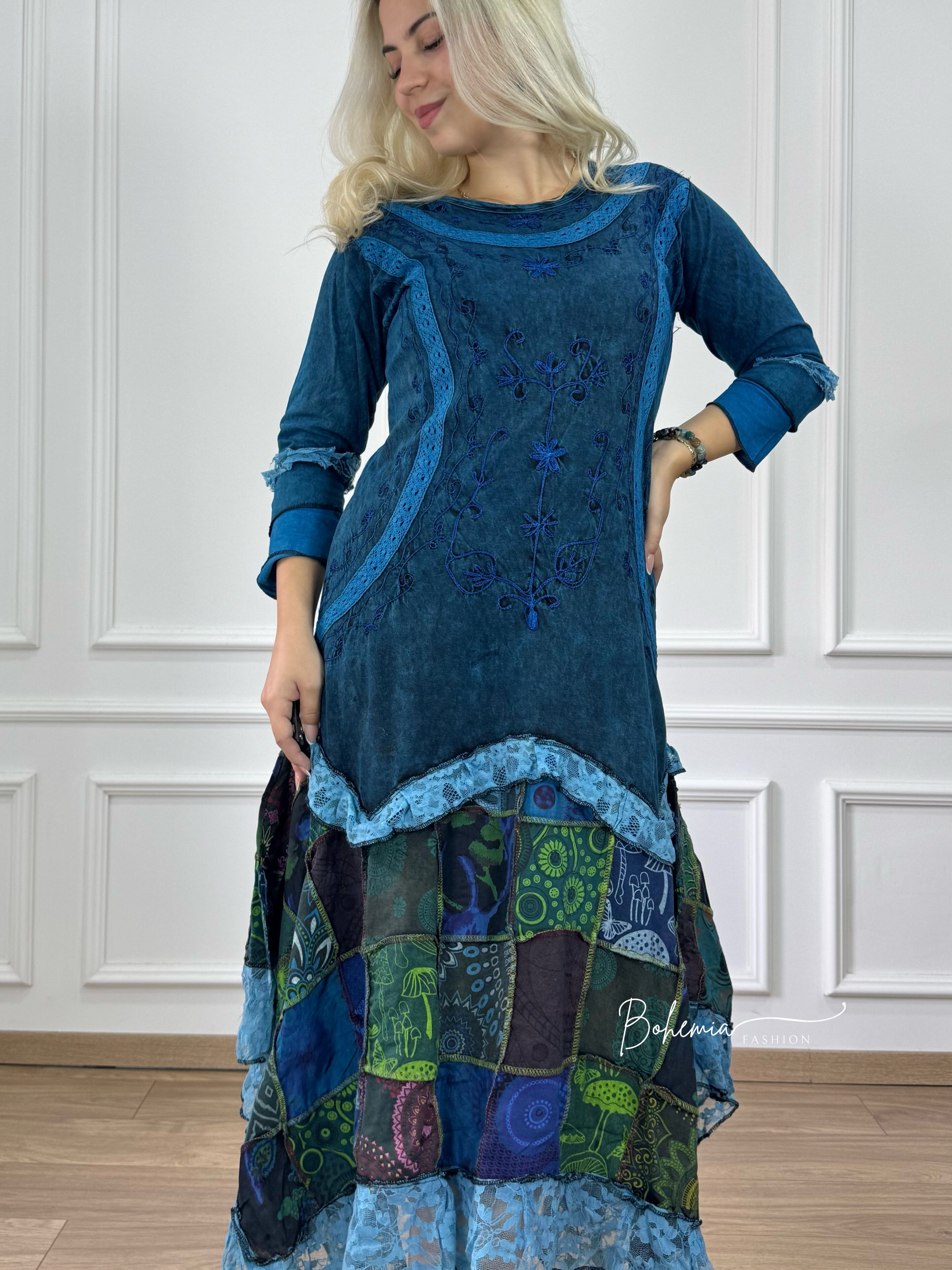 Patchwork mintás szoknyarész és gazdag hímzések jellemzik ezt a 3/4 ujjú ruhát. A puha pamut anyaga egész napos kényelmet biztosít. Színes mintái és különleges szabása teszi ezt a ruhát ideálissá azok számára, akik szeretik az egyedi, bohém öltözködést.