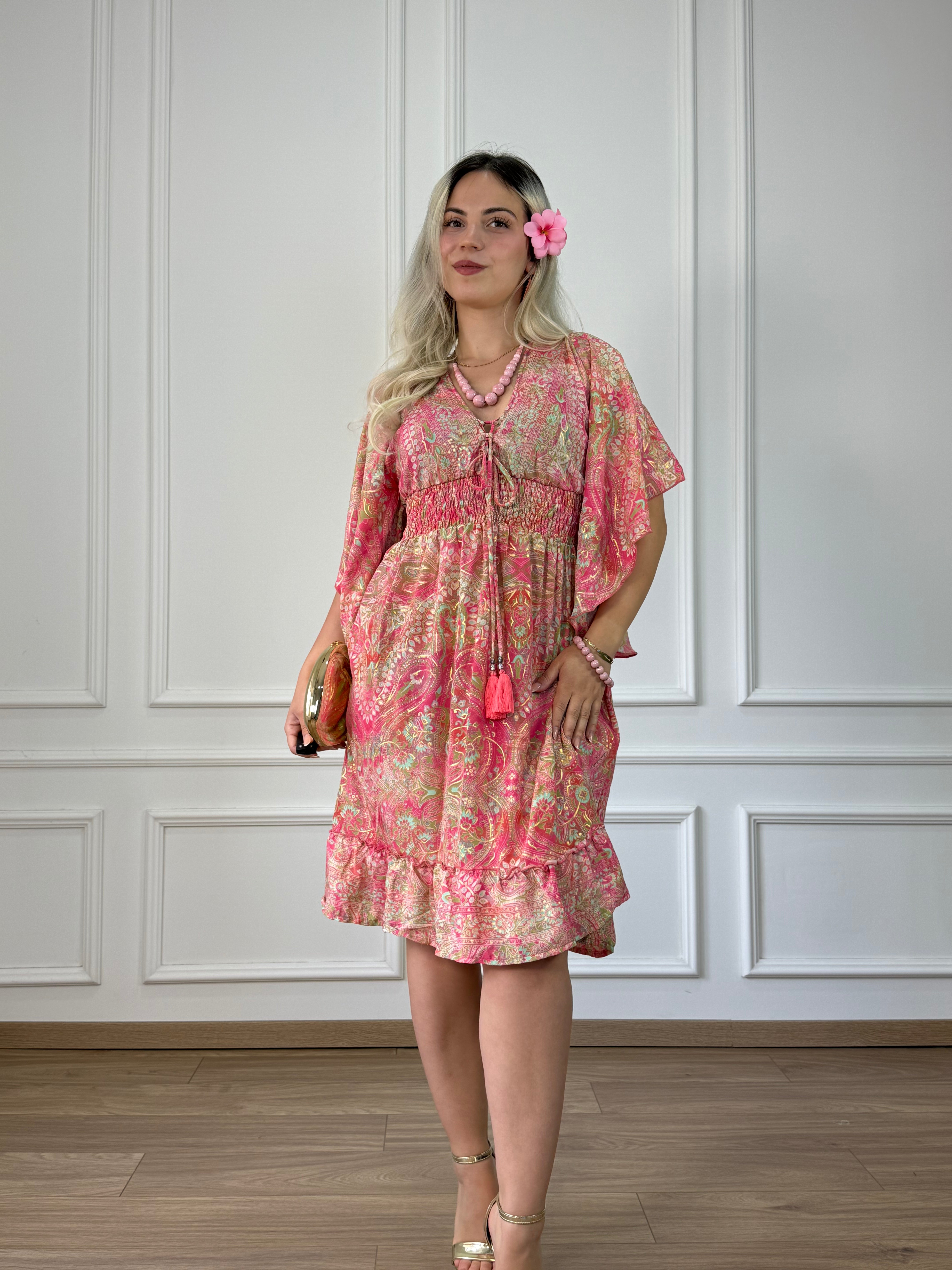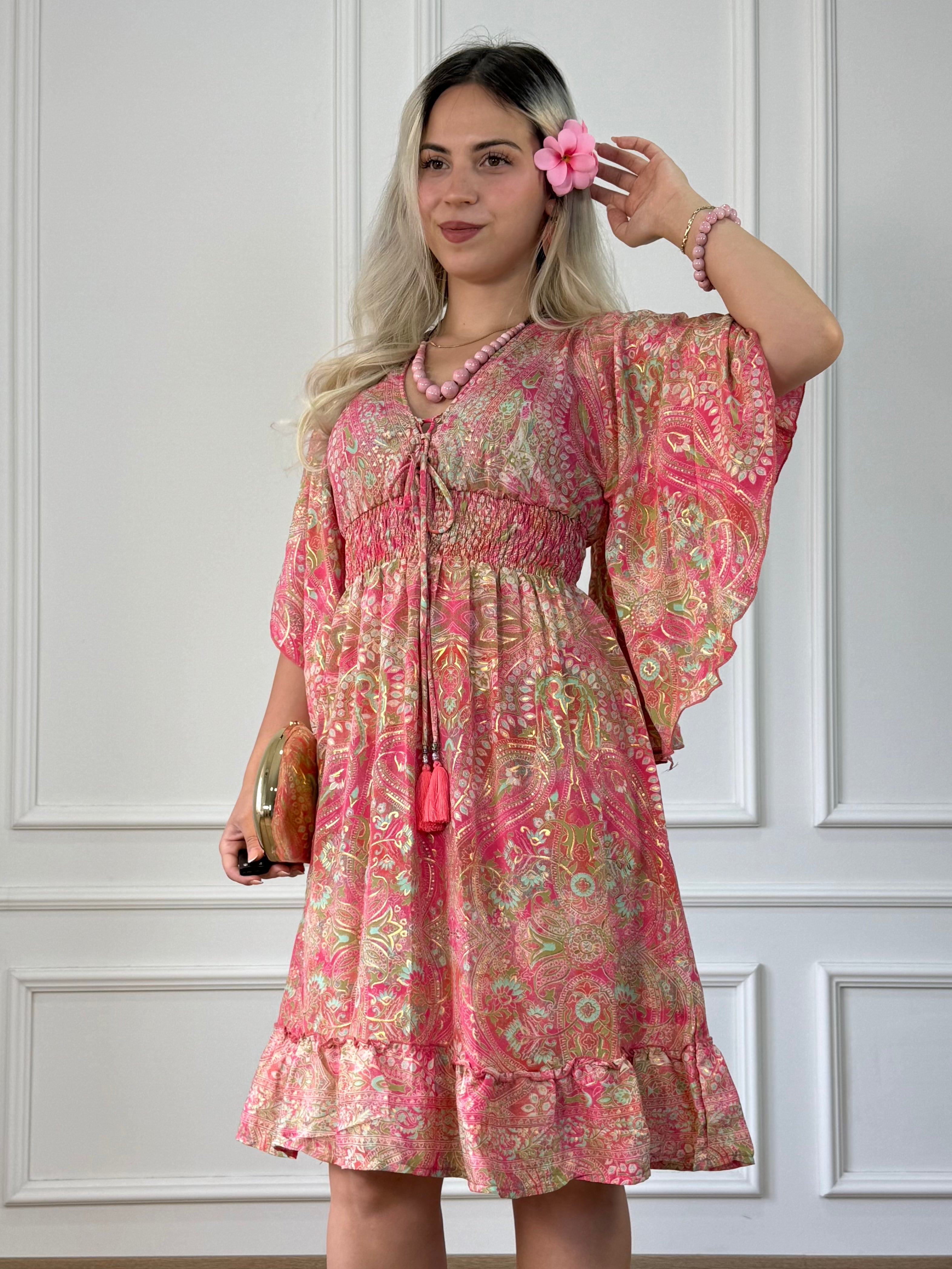 Kurzes Kleid in Seidenoptik mit V-Ausschnitt, Glockenärmeln, V-Ausschnitt am Rücken und elastischer Taille.
