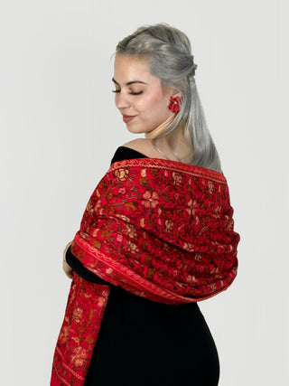 Eșarfă roșie cu model floral brodat – caldă, cu detalii fine