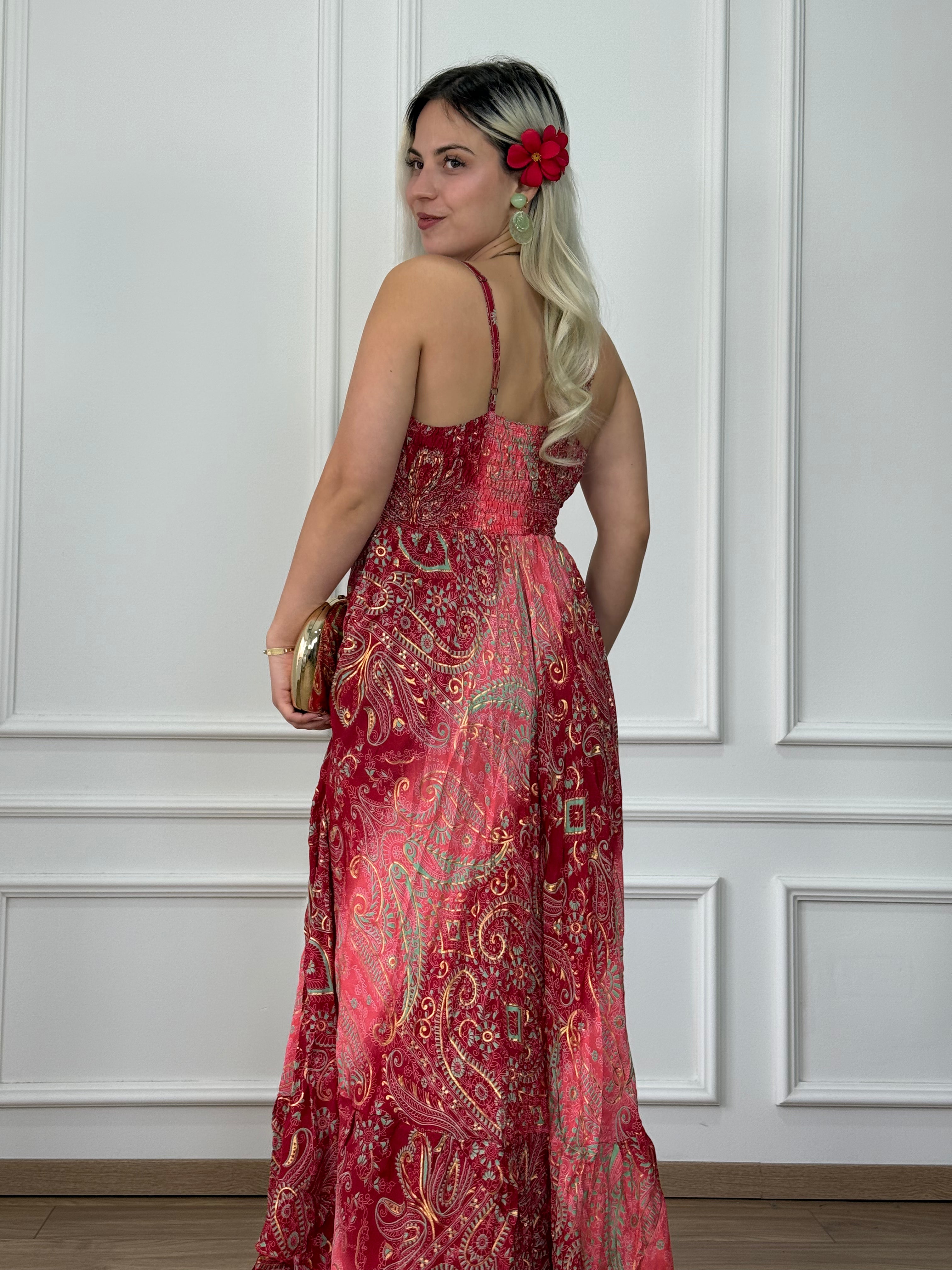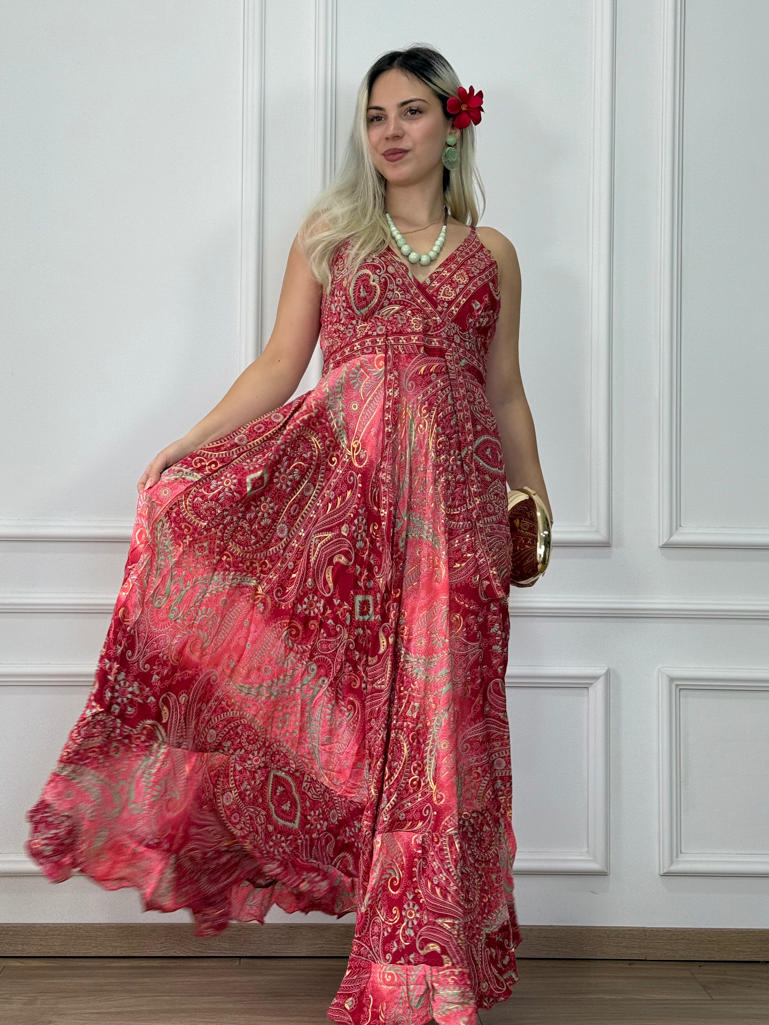Silk-effect maxi dress that can be pulled under the bust and widens from the hips down, with adjustable shoulder straps, V-neckline, and elasticated back.