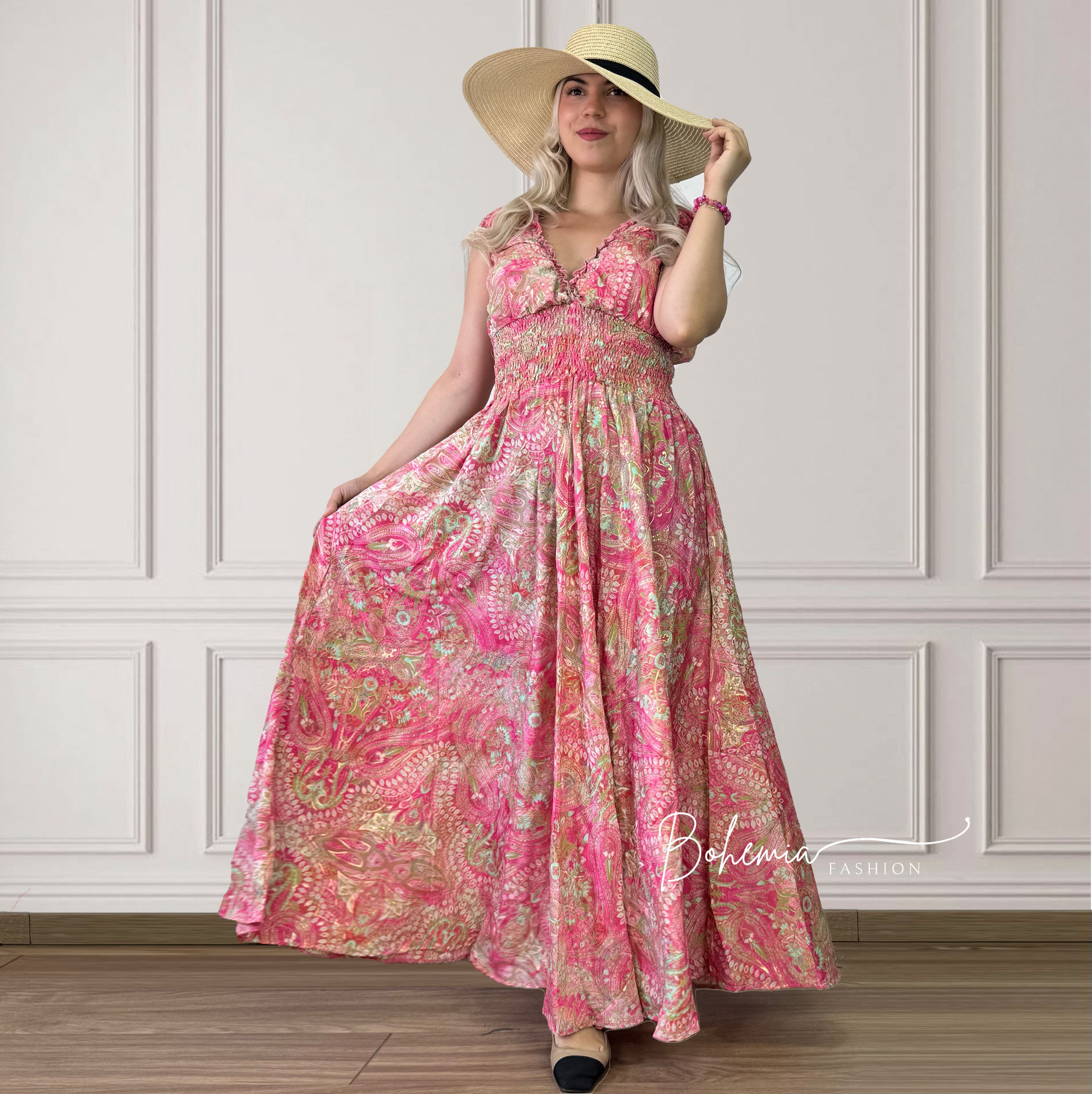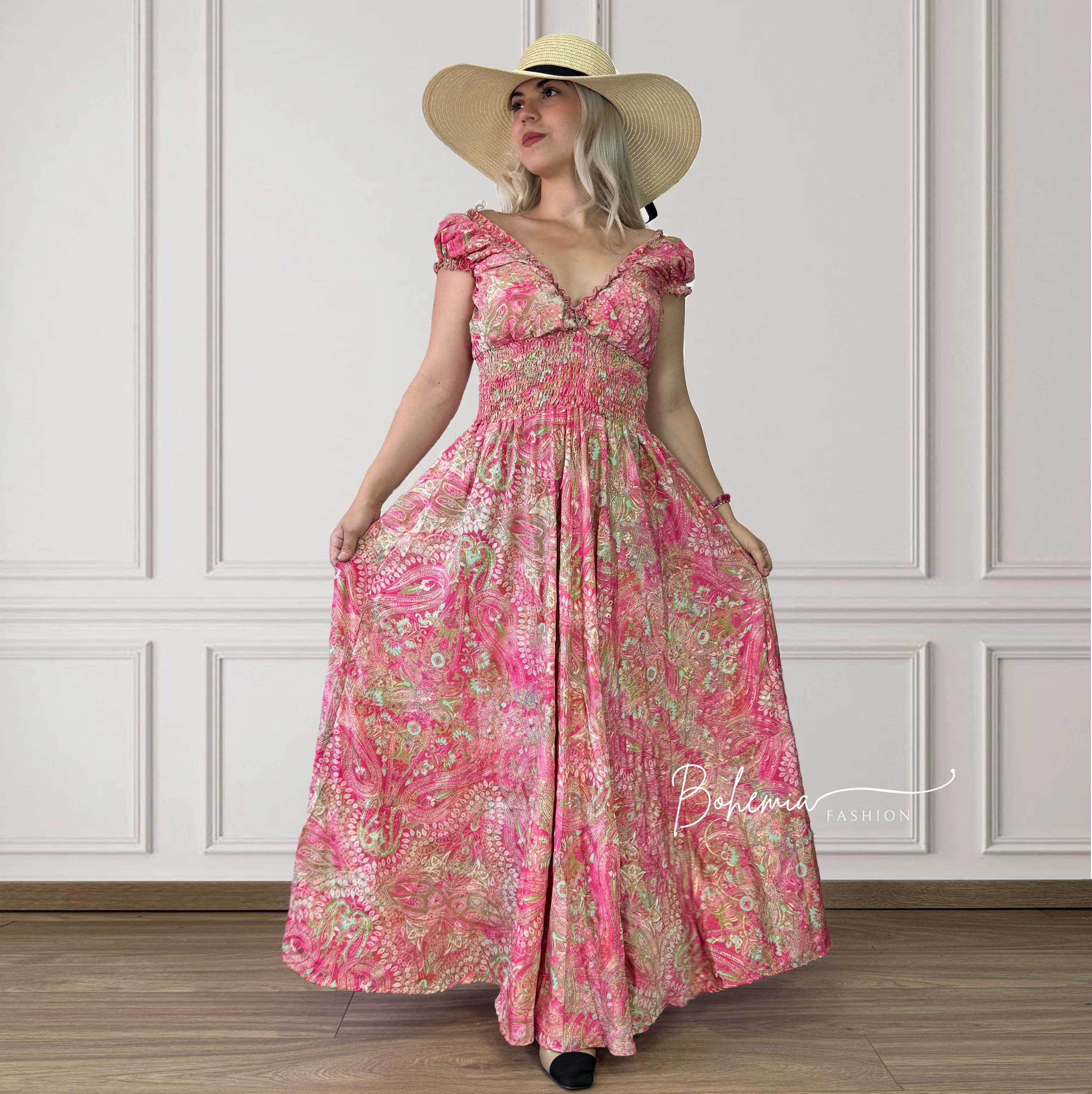 A casual maxi dress with a cinched waist and a V-neck. The fabric gives the wearer elegant movement, while the elasticated top follows the figure beautifully. For a more romantic effect, the small sleeves can be pulled down over the shoulder.