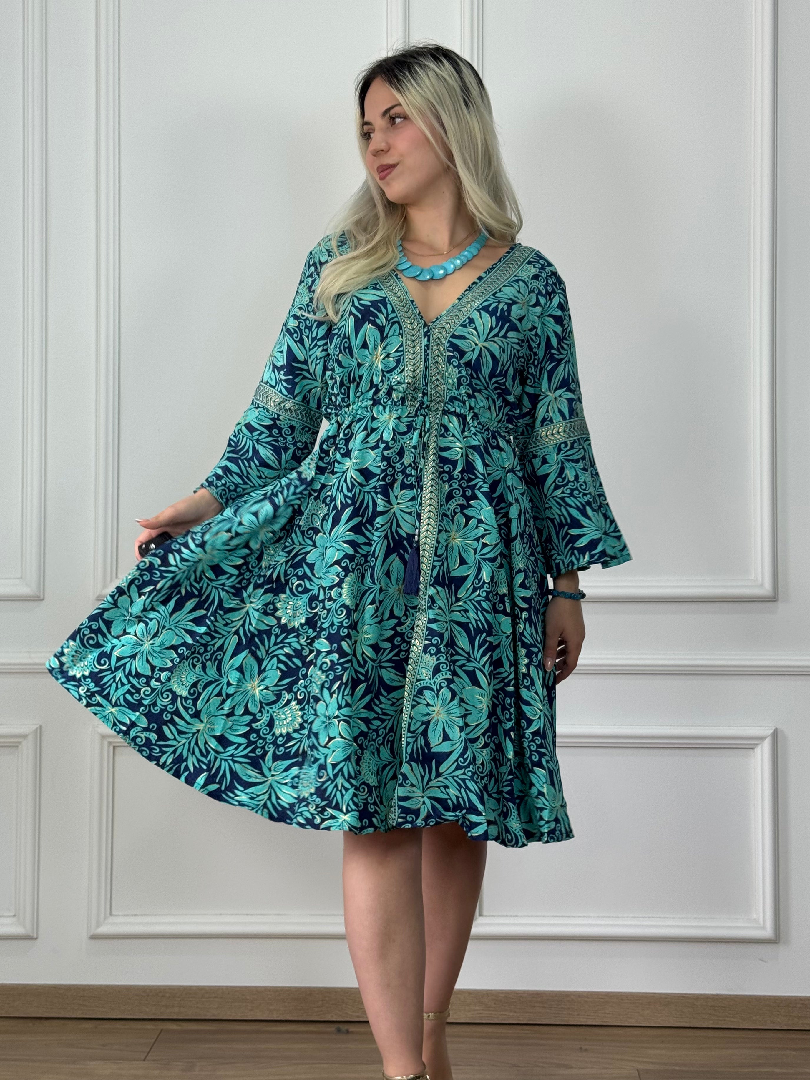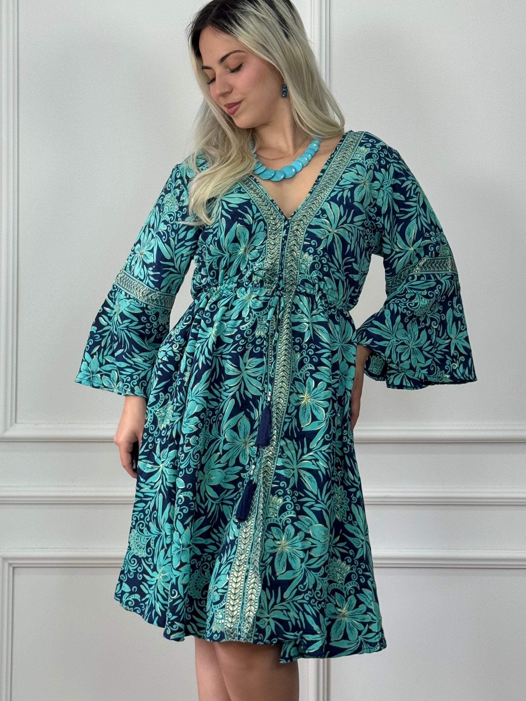 This silk-effect short dress with a gathered waist is the perfect blend of casual elegance and feminine lines. The loose fit ensures a comfortable fit, while the V-neck and bell sleeves create a soft, sophisticated look. The adjustable tie at the waist highlights the figure, keeping you airy and pretty at the same time.