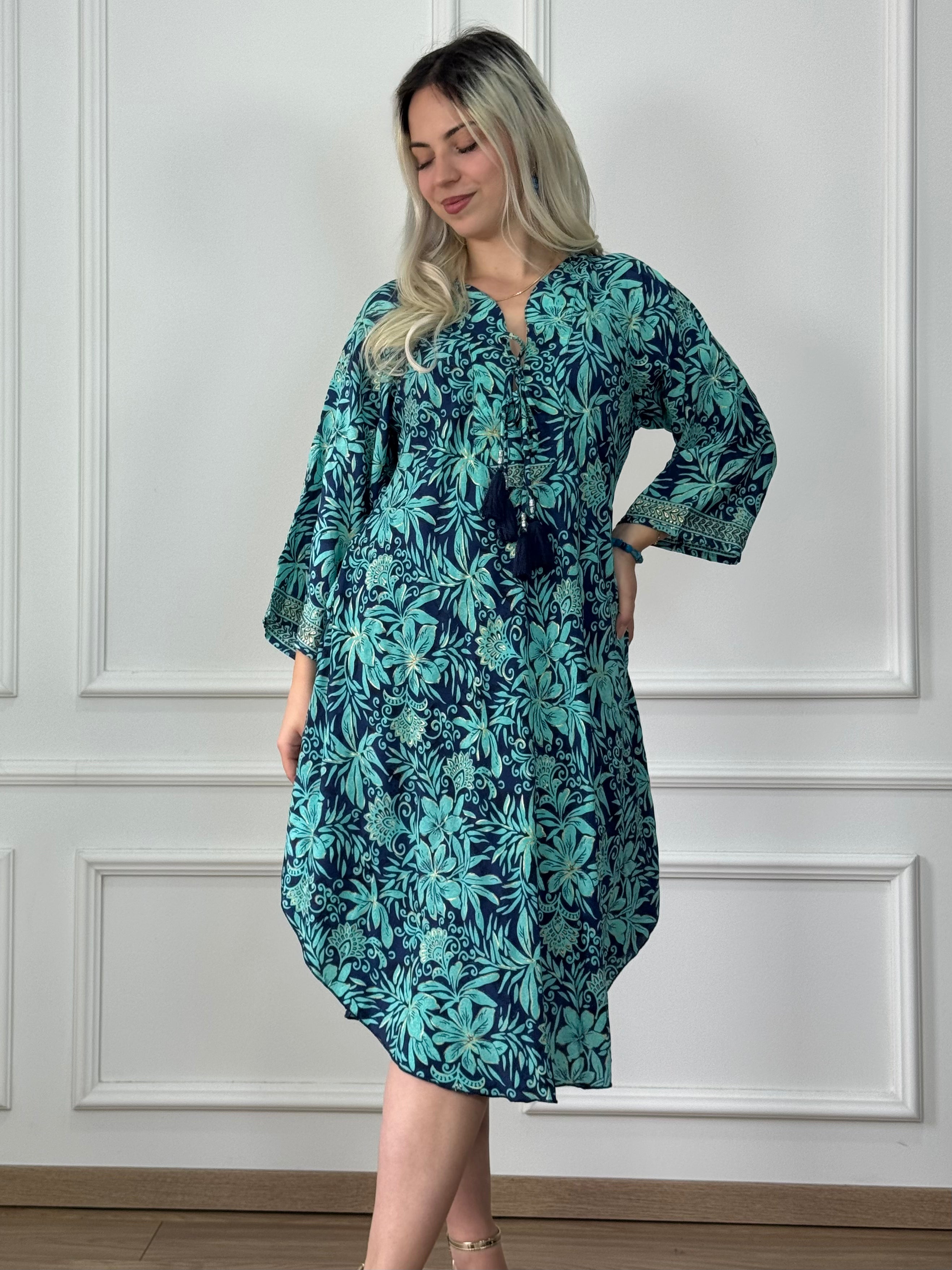 Könnyed, bő fazonú selyemhatású tunika kerekített aljjal és két dekoratív megkötővel a mellrészen. Kényelmes, laza szabású. Ruhaként és felsőként is egyaránt viselhető.