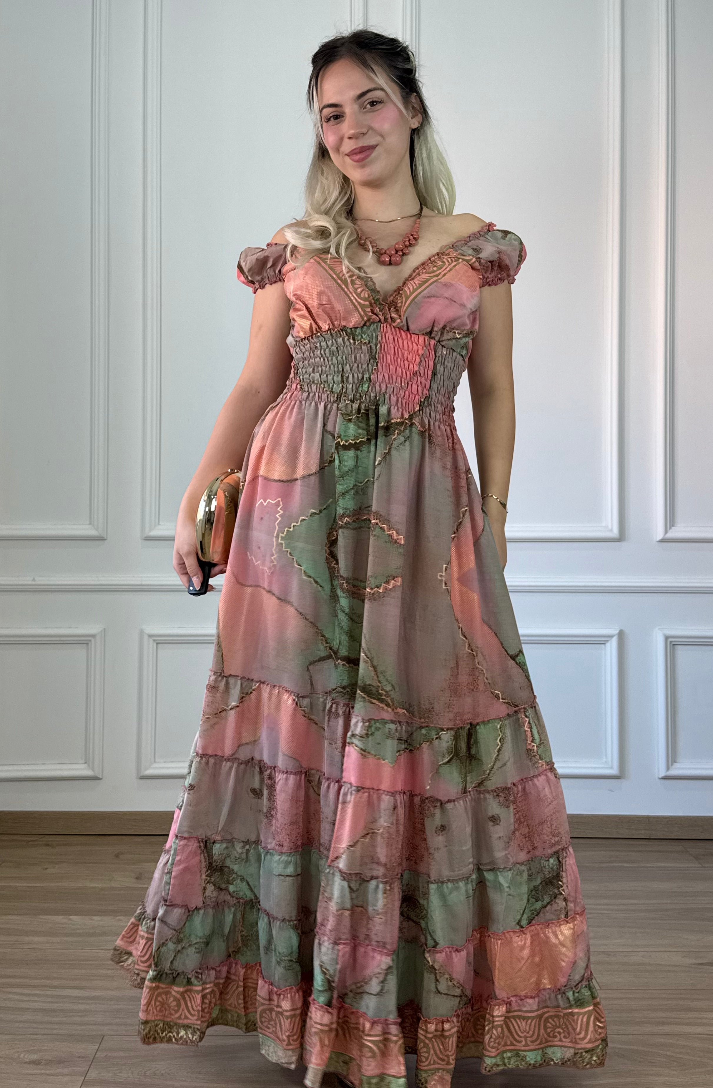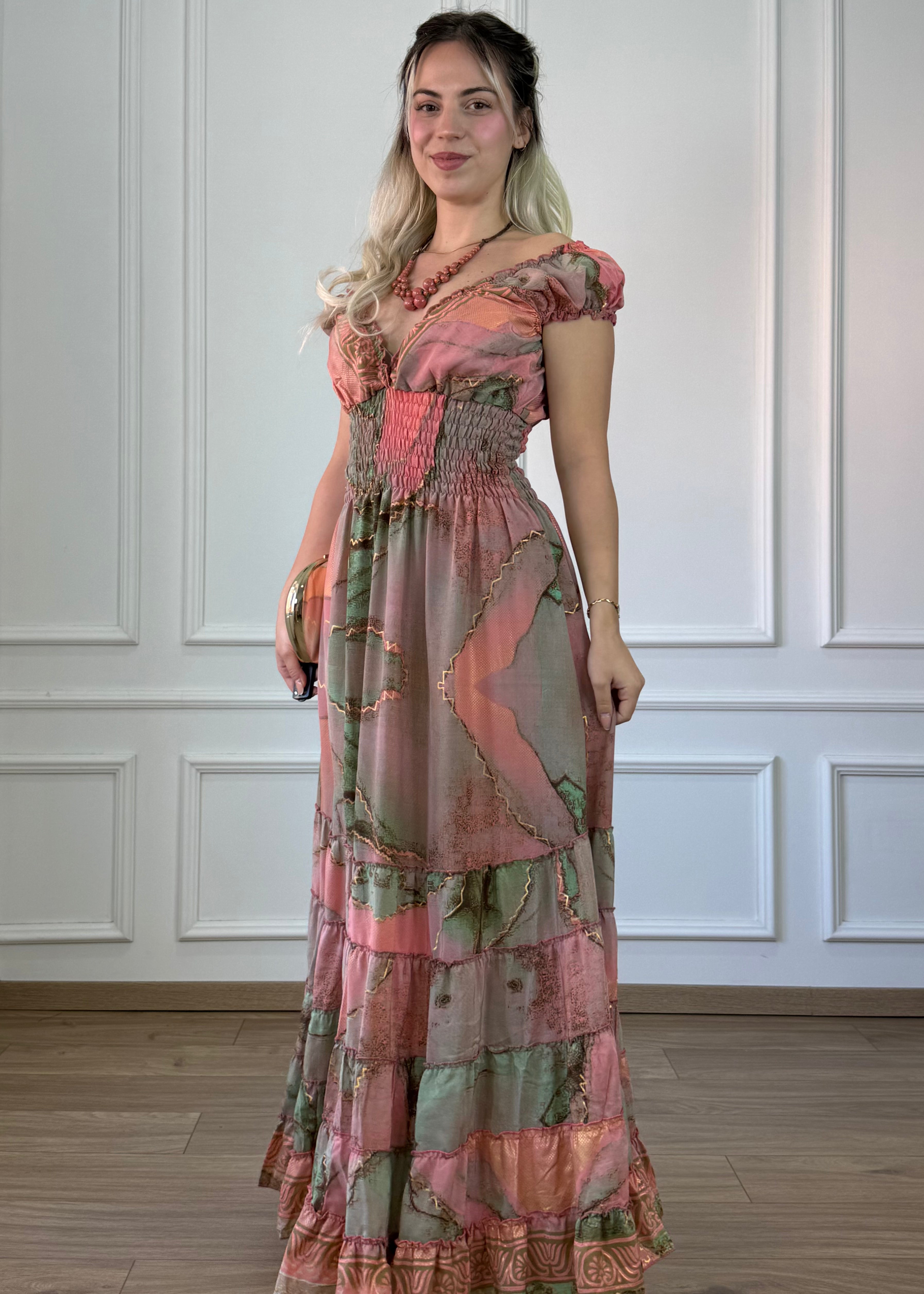 Lezser esésű, maxiruha, darázsolt derékrésszel és V kivágással. Az anyag elegáns mozgást kölcsönöz viselőjének, miközben a gumírozott felsőrész szépen követi az alakot. Romantikusabb hatásért a kis ujjrészt le is lehet húzni a vállra.