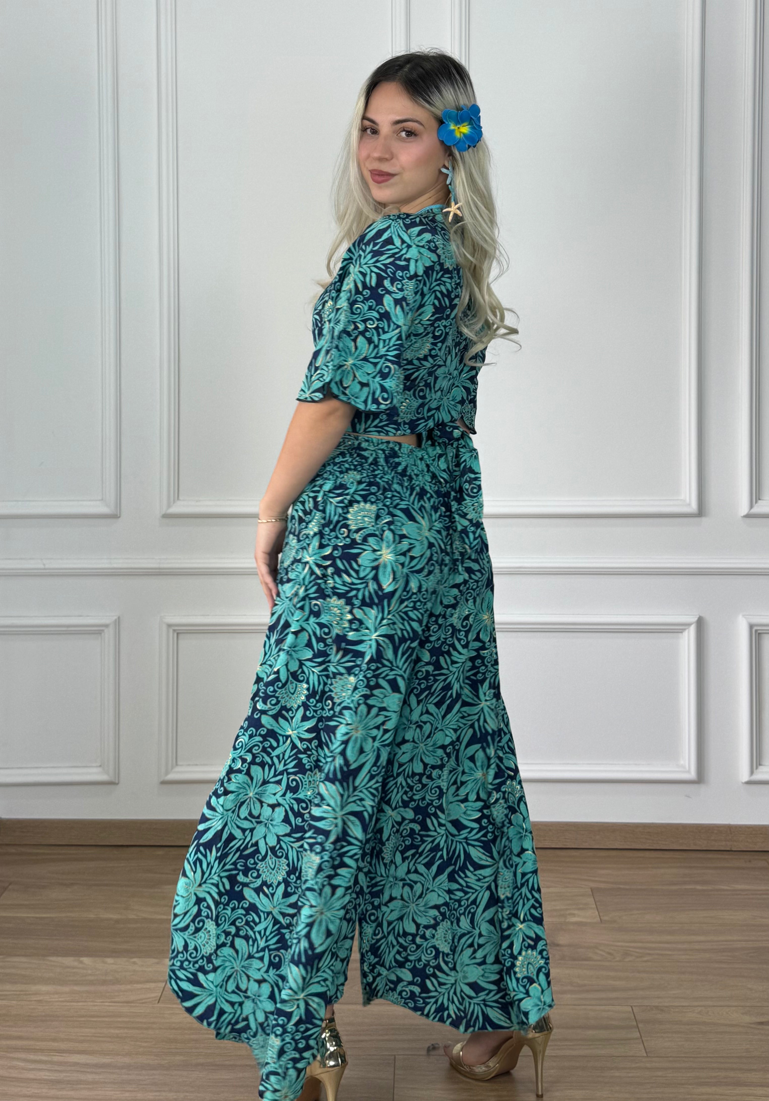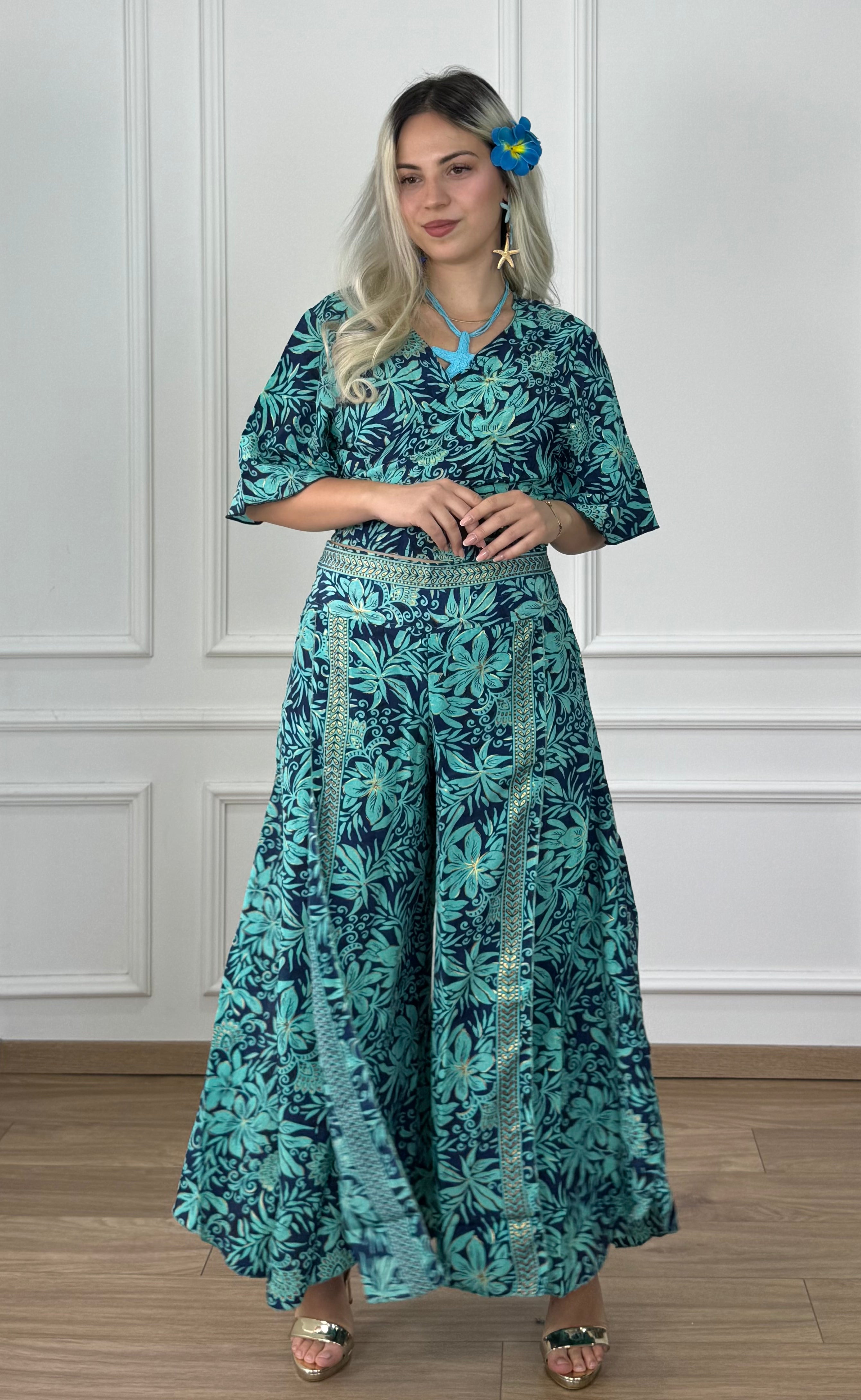 Hosszú, lefelé lágyan bővülő nadrág, hátul gumírozott derékrésszel. Oldalt térdig felnyíló szabás, elöl átlapolt kialakítással.