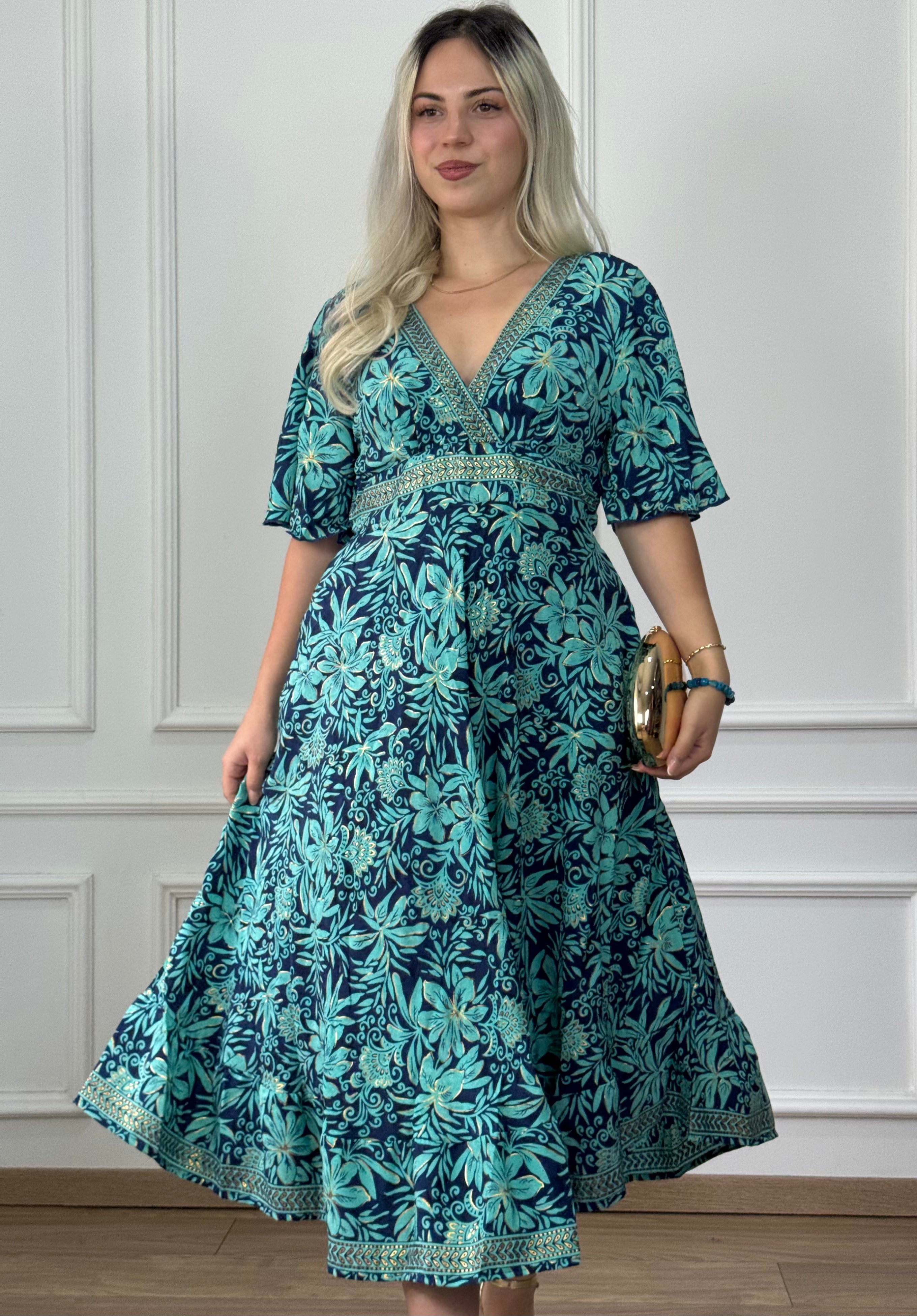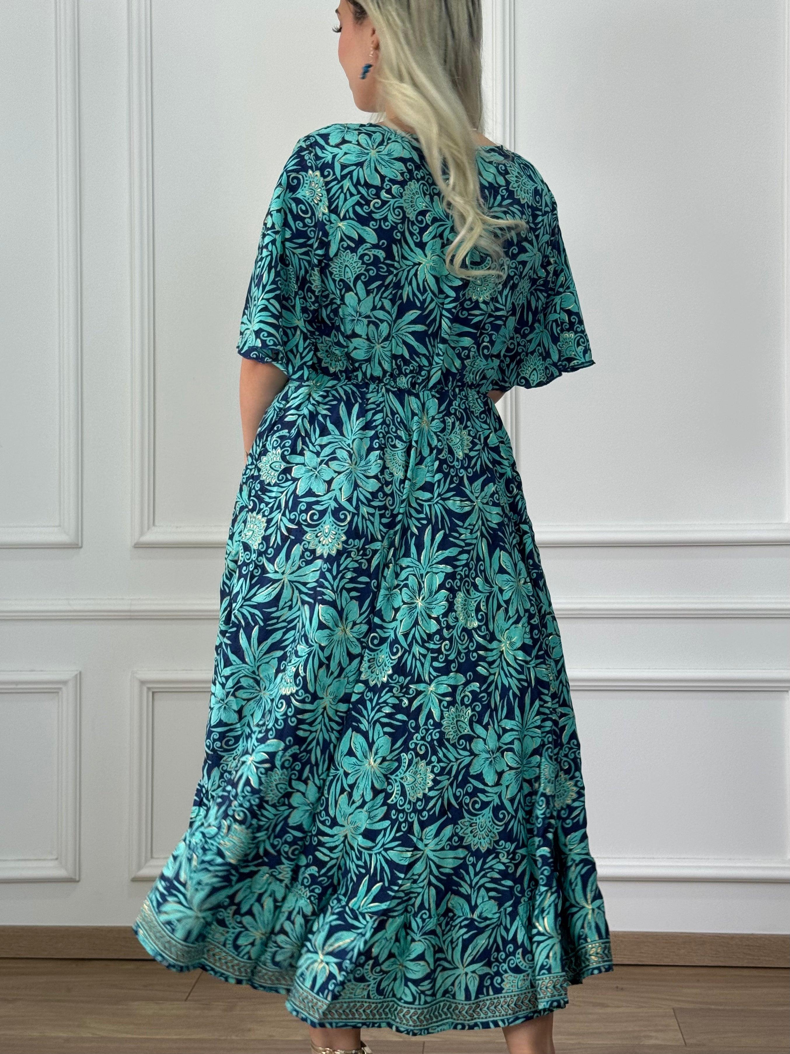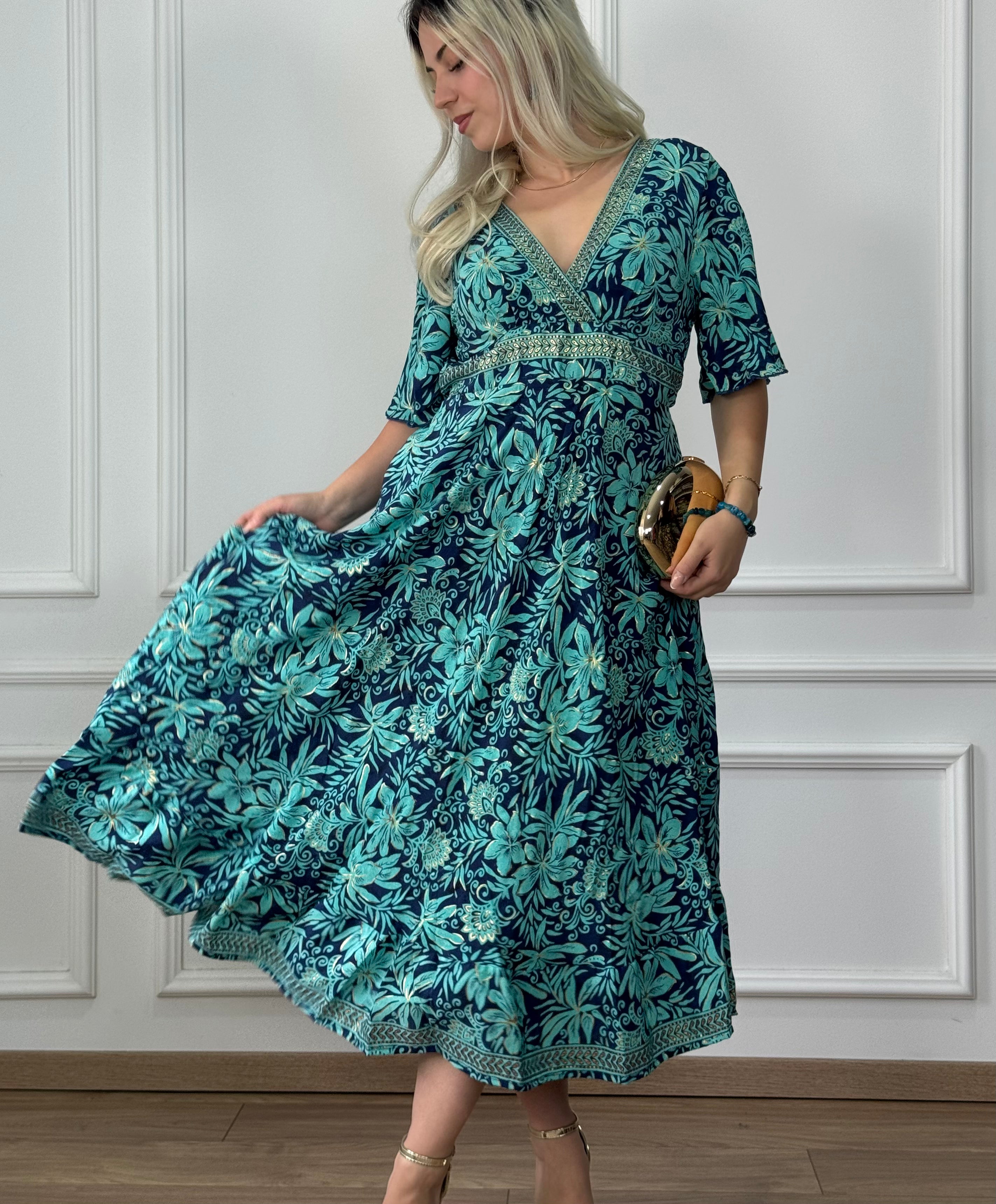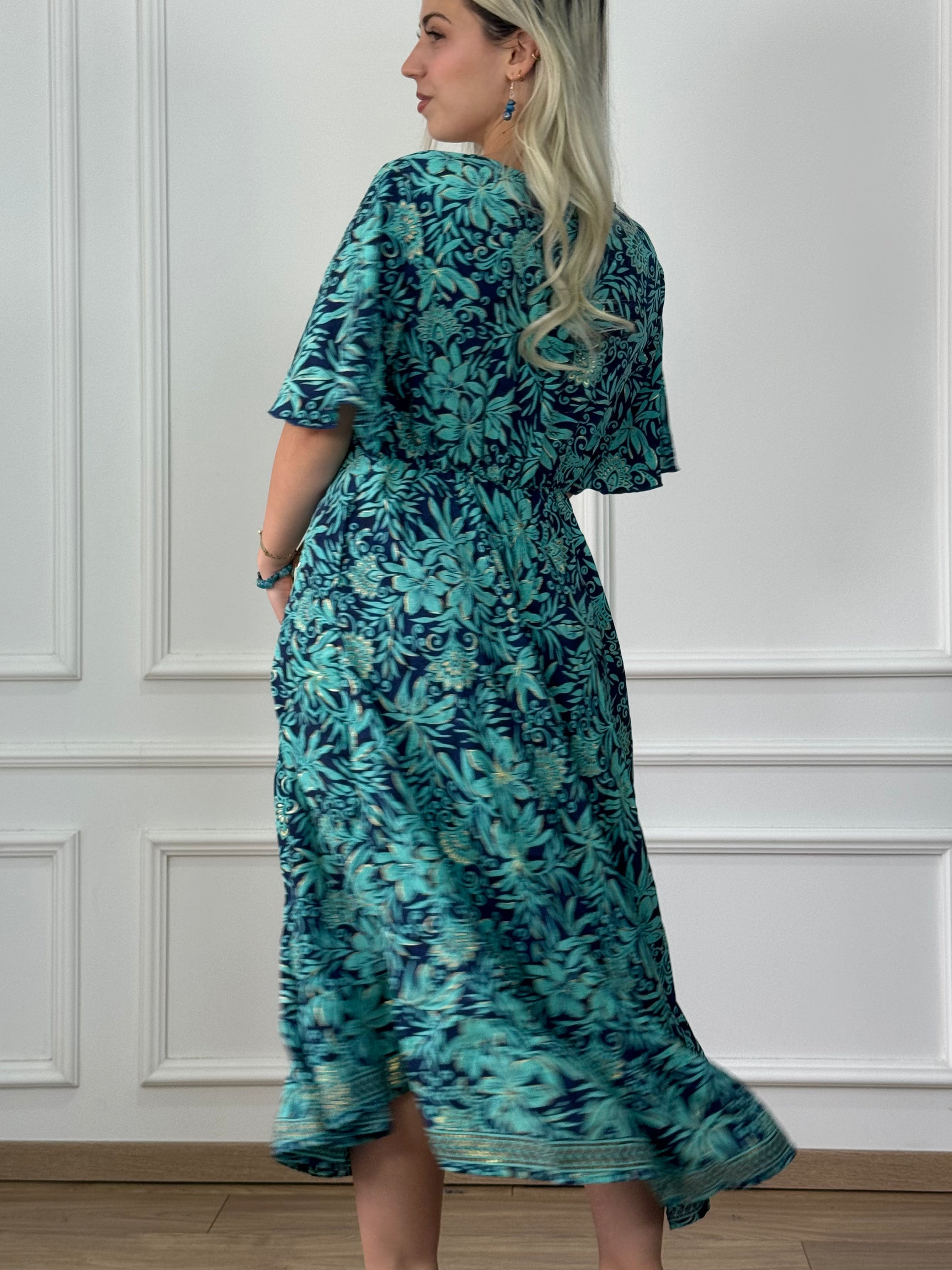 Rochie midi ușoară și elegantă, cu efect de mătase, care urmează delicat mișcarea, oferind în același timp o purtare plăcută. Pieptul suprapus și mânecile cu cădere lină conferă un aspect romantic, în timp ce talia elastică din spate evidențiază silueta. Buzunarele de pe lateral sunt un adaos practic. Marginea fustei evazate este împodobită cu volane.