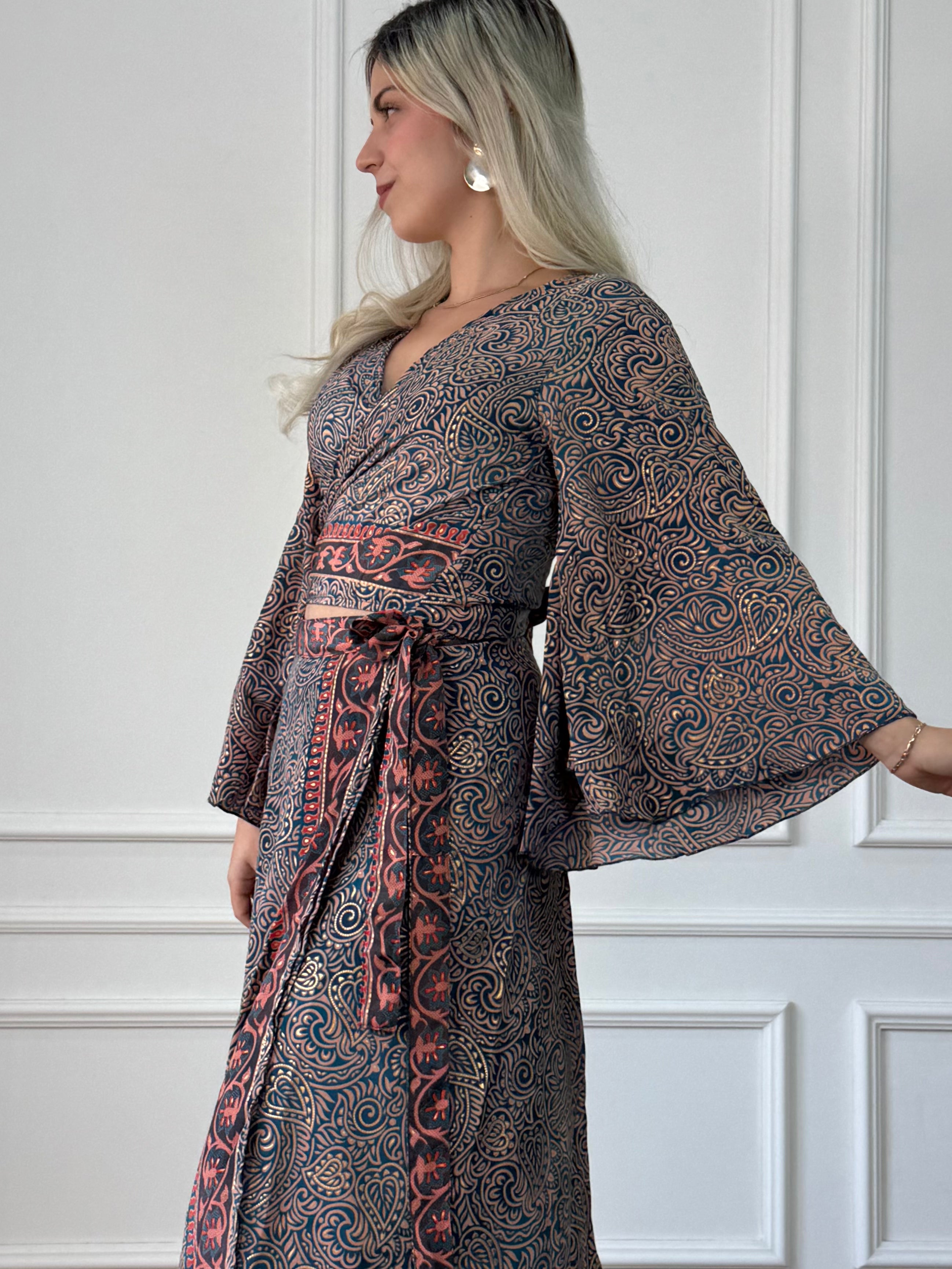 Bluză care se leagă în față sau în spate, cu mâneci evazate.