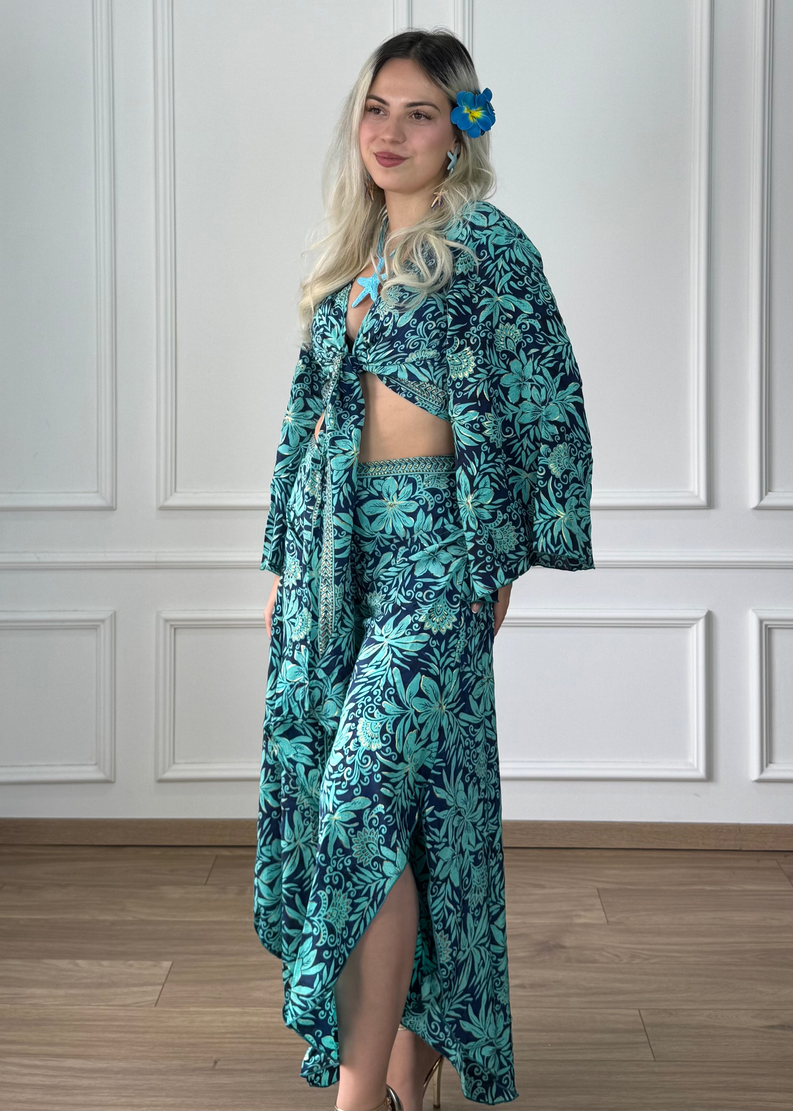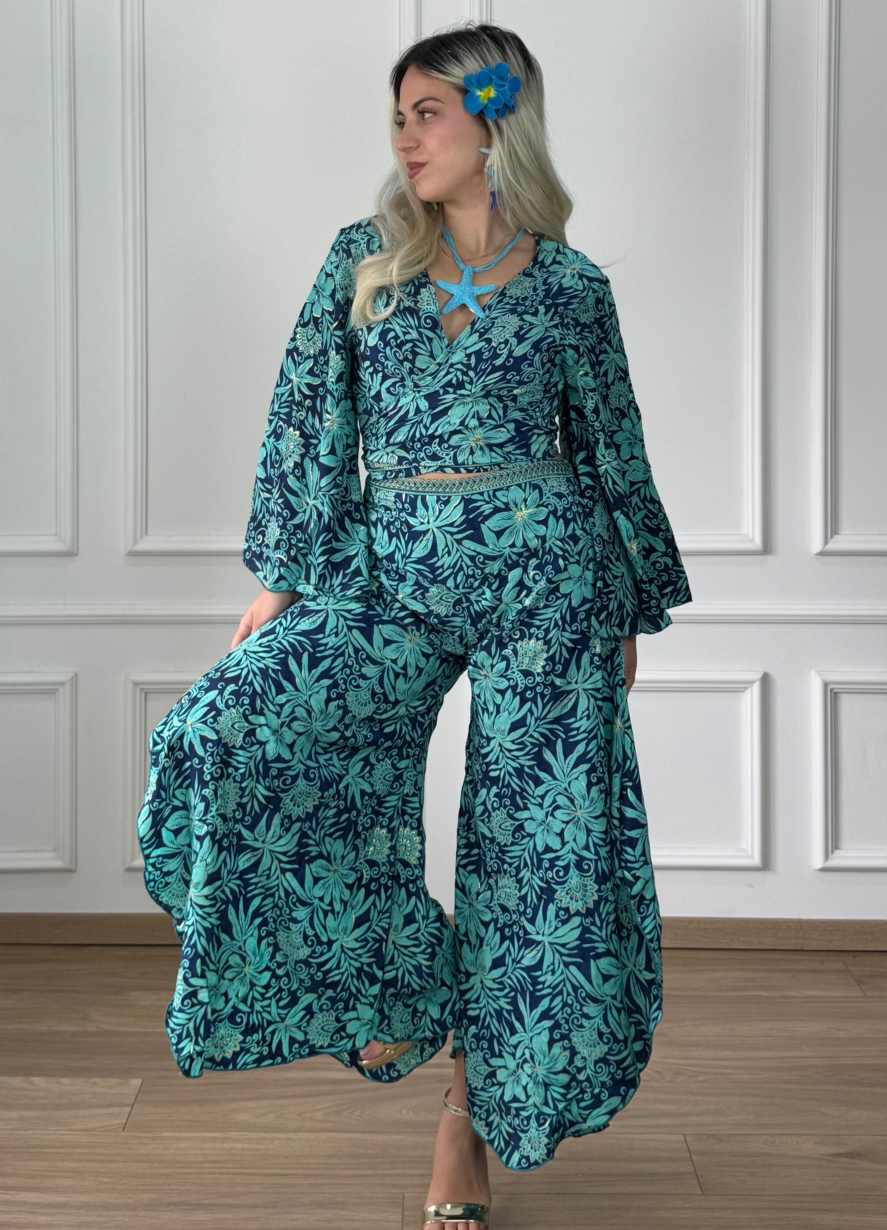 Pantaloni lungi, evazați spre partea de jos, cu talie elastică în spate, deschiși pe lateral până la genunchi.