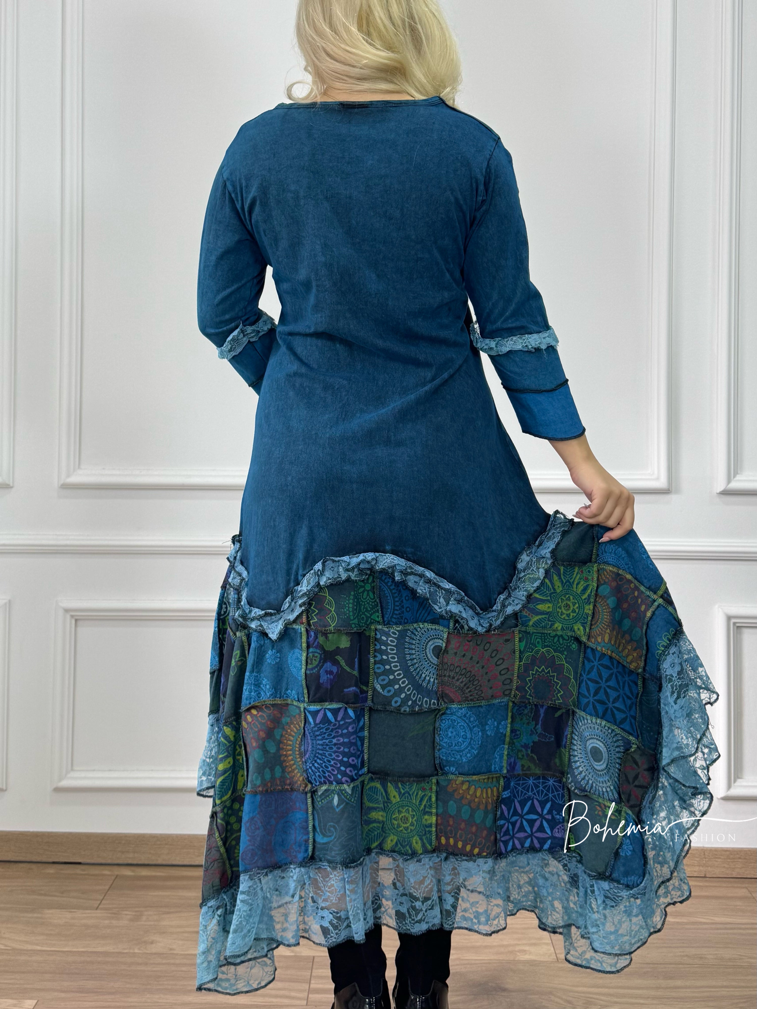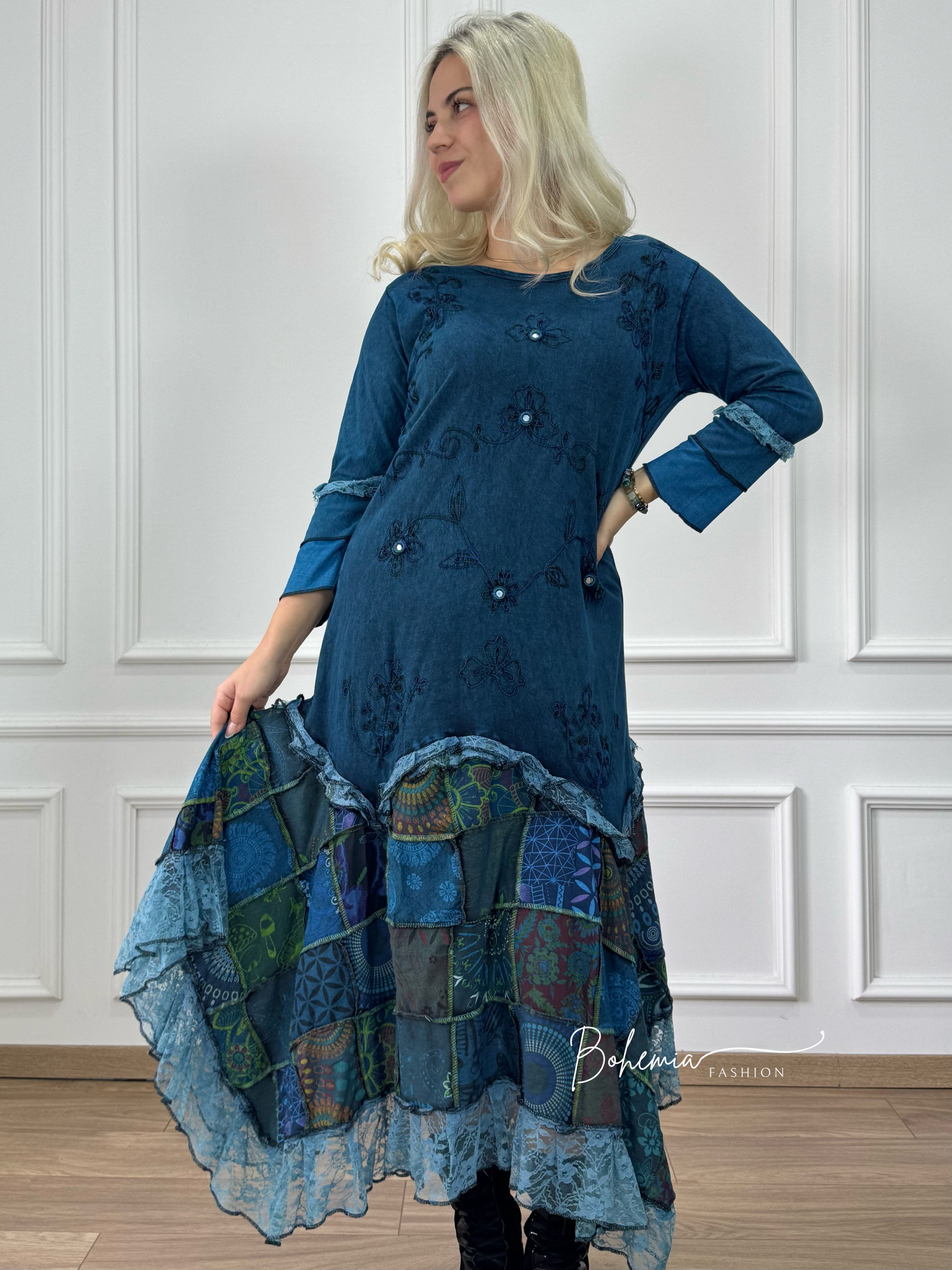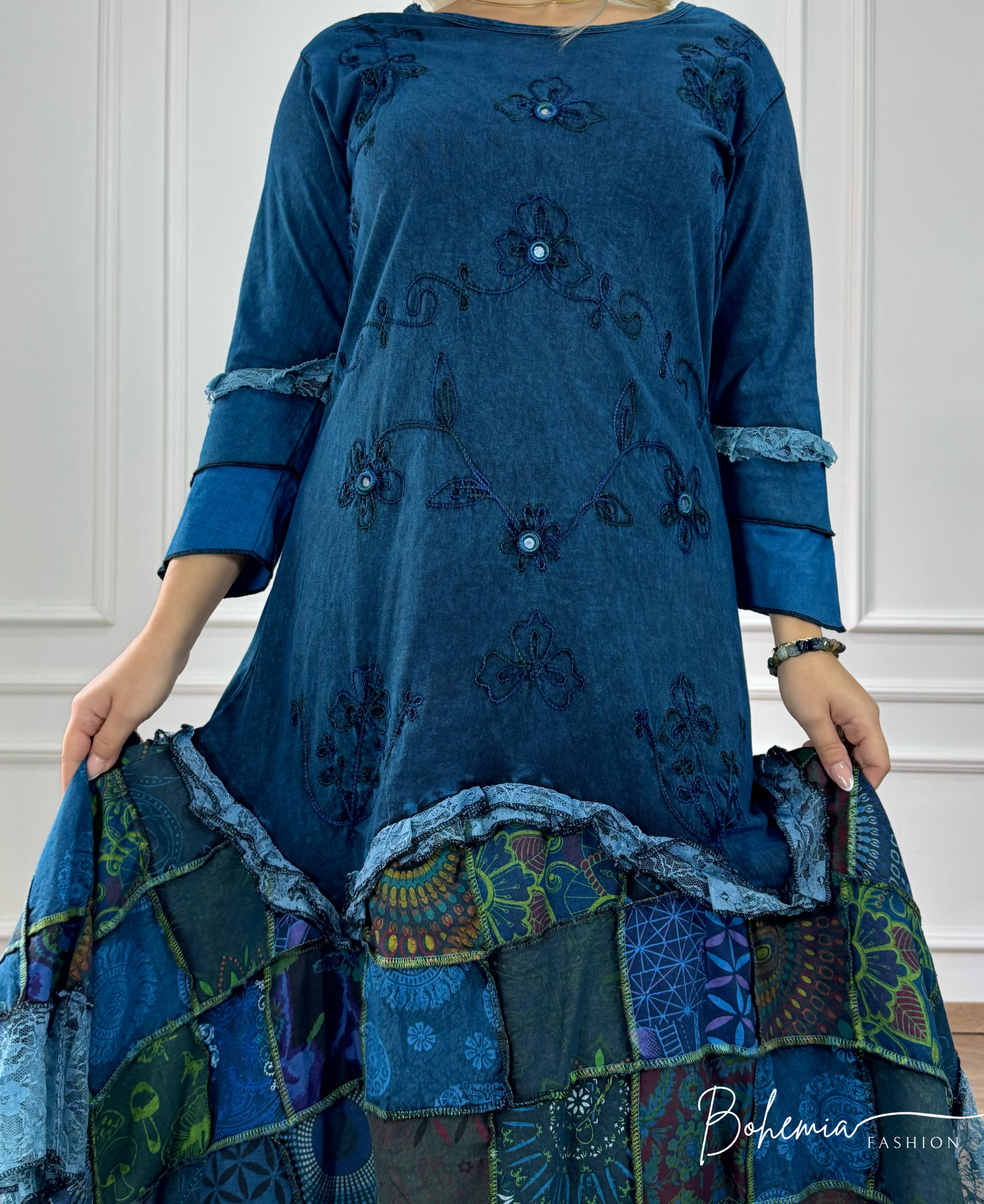 Hímzett patchwork ruha apró tükrökkel és csipkeszegéllyel az alján. A puha pamut anyaga egész napos kényelmet biztosít. Színes mintái és különleges szabása teszi ezt a ruhát ideálissá azok számára, akik szeretik az egyedi, bohém öltözködést.