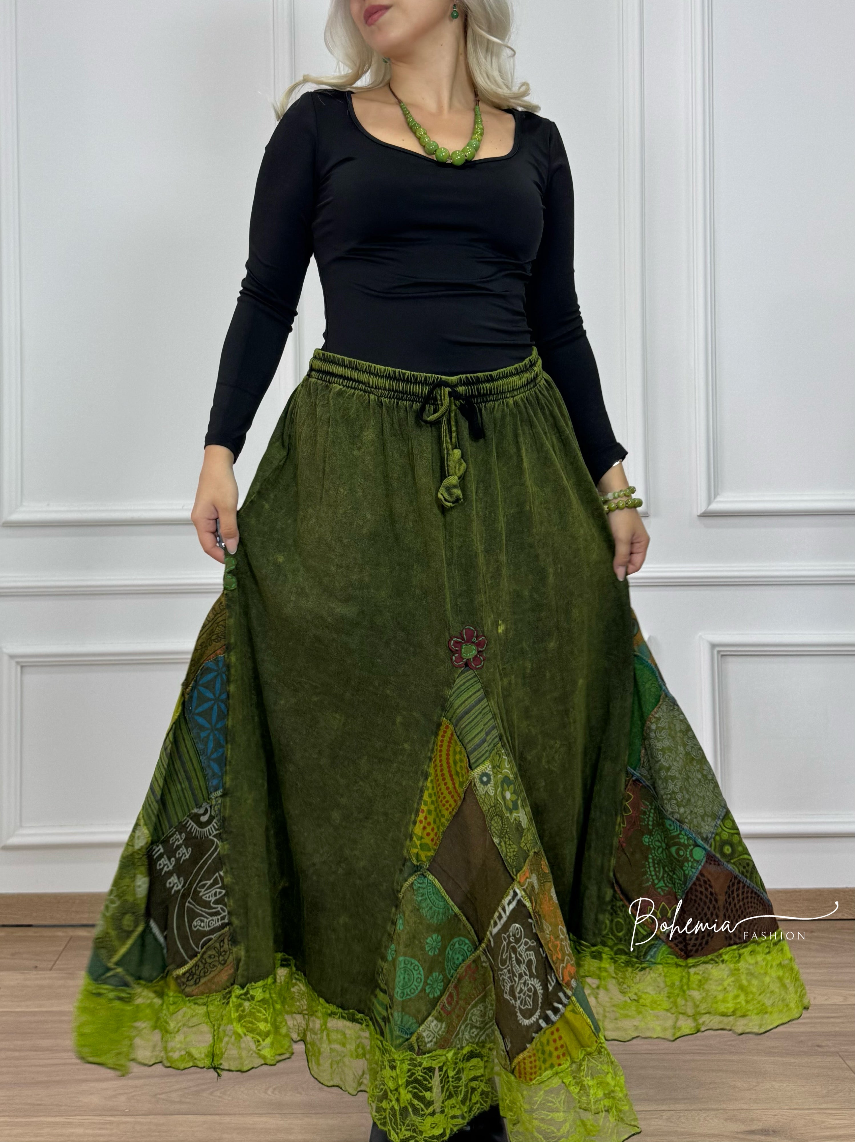 Bő, A-vonalú, patchwork mintás szoknya gumis derékrésszel. Kőmosott pamut anyaga egész napos komfortot nyújt. A csipkés részletek nőiességet, miközben színes mintái és egyedi szabása igazán bohém stílust kölcsönöznek a darabnak, tökéletes választás az egyedi megjelenés kedvelőinek.