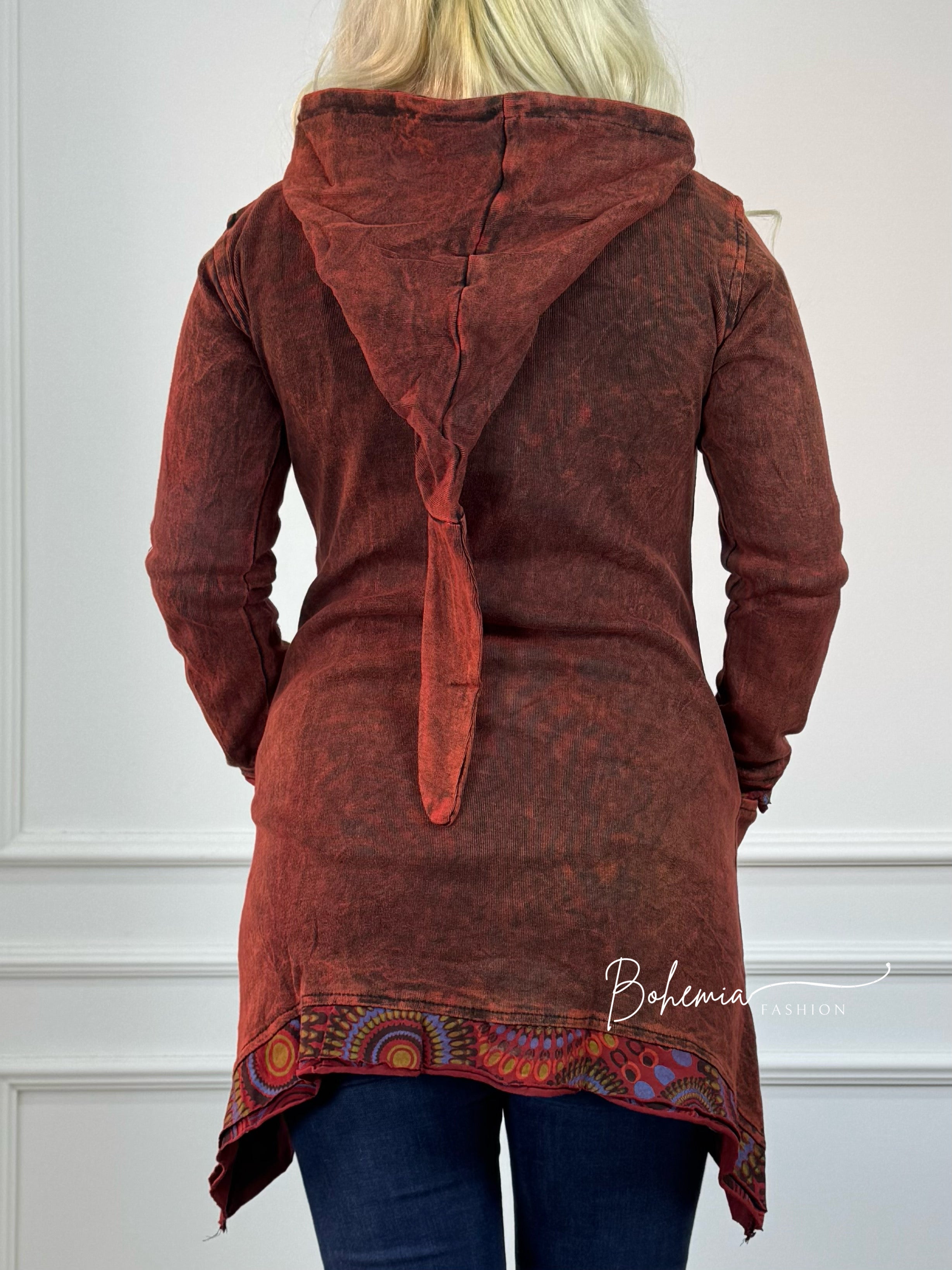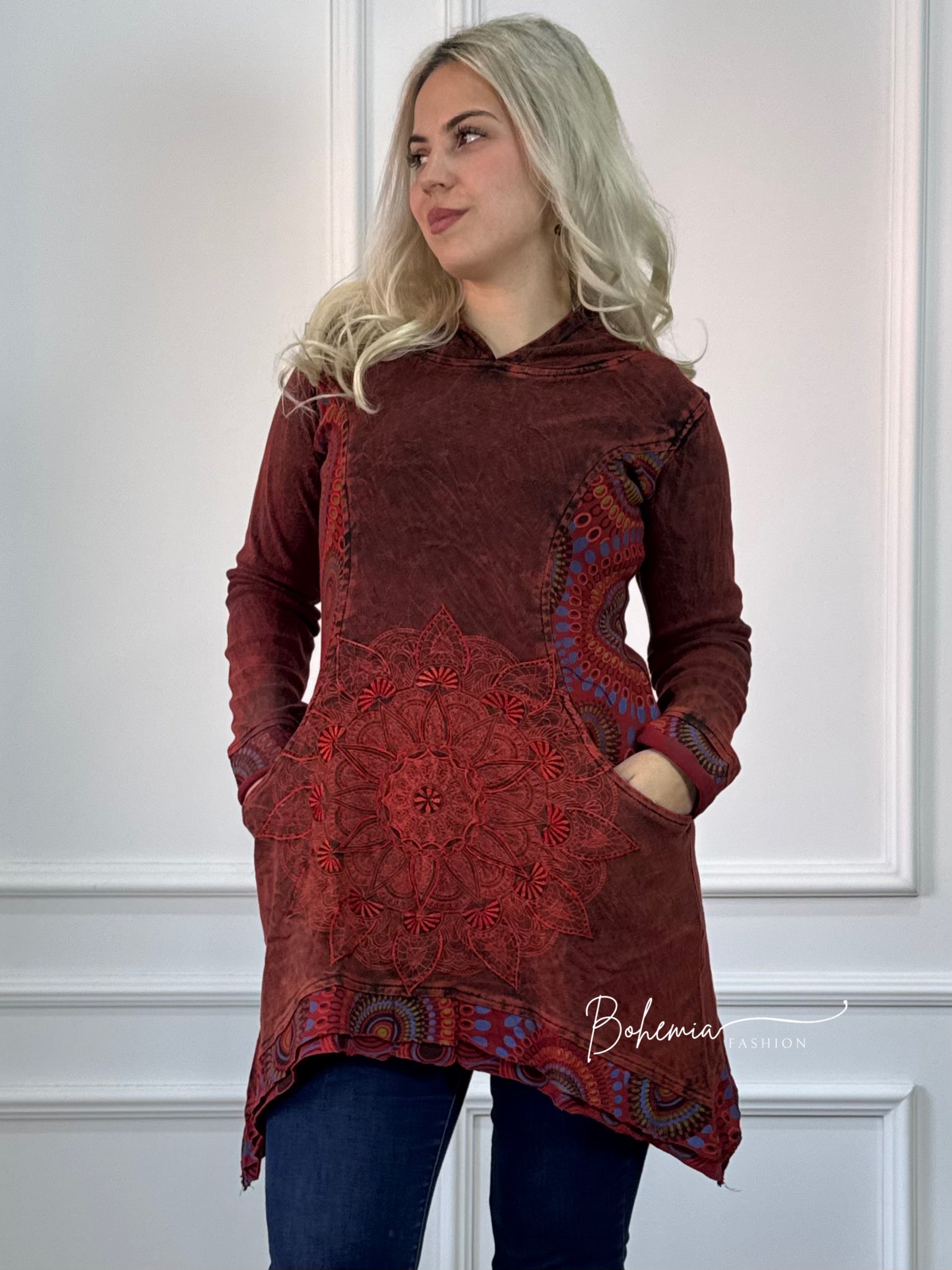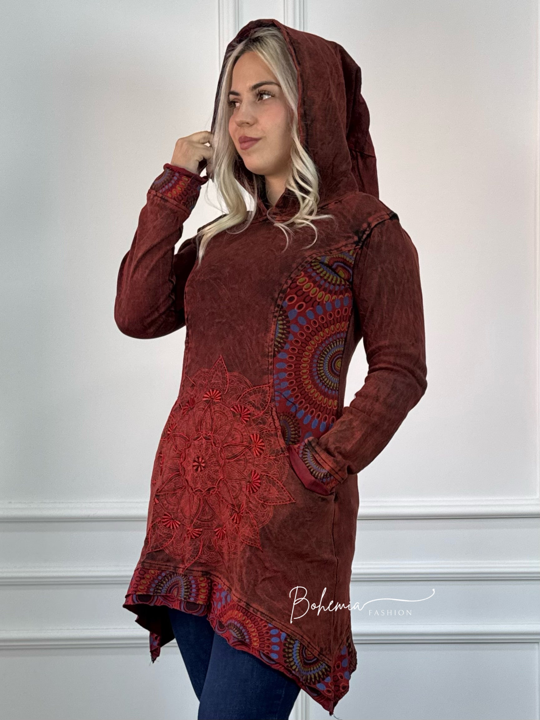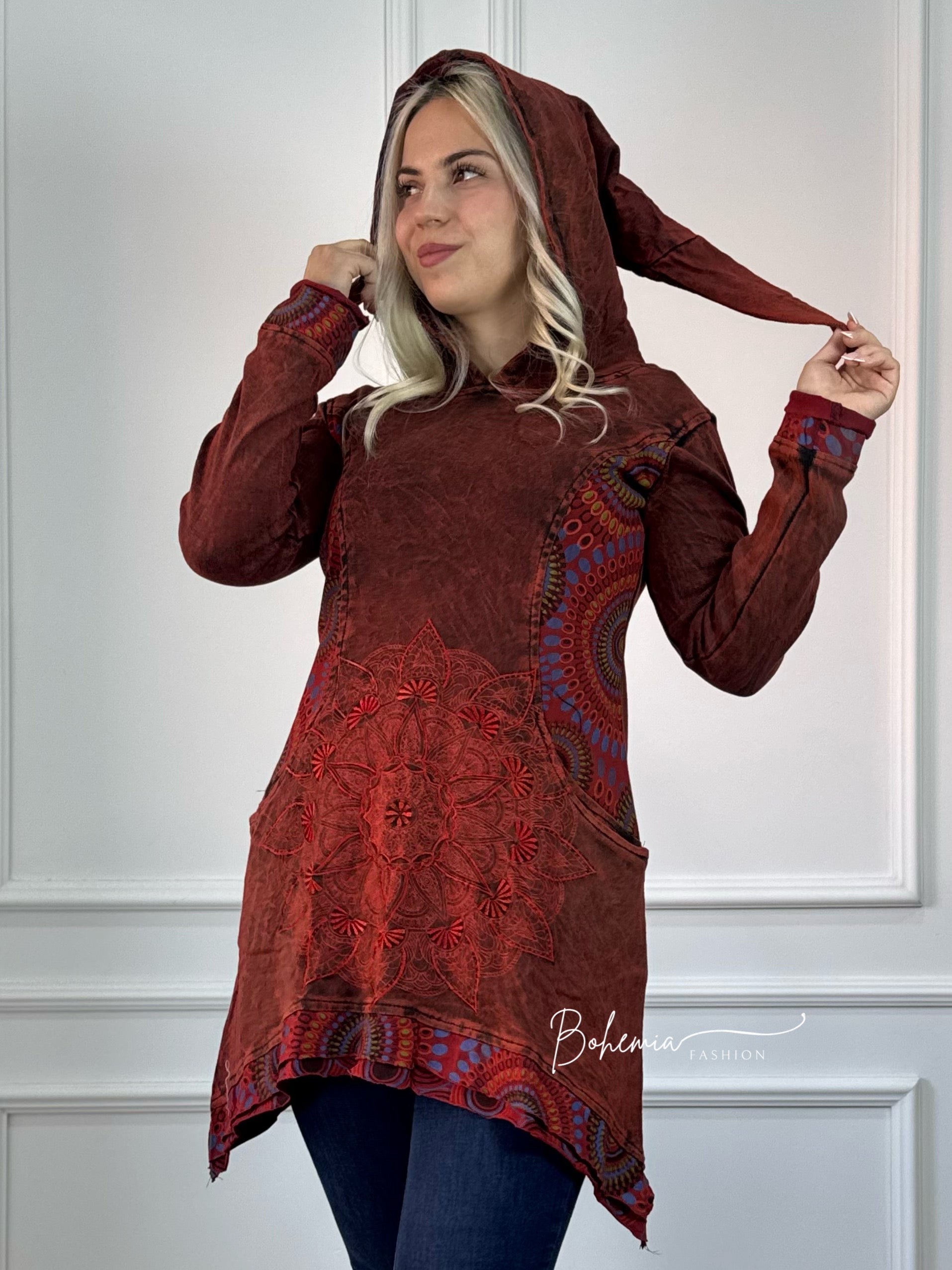 Spălat cu piatră, pulover din bumbac cu croială lungă, brodat în față cu un model de mandala. Cu două buzunare laterale și glugă de elf.