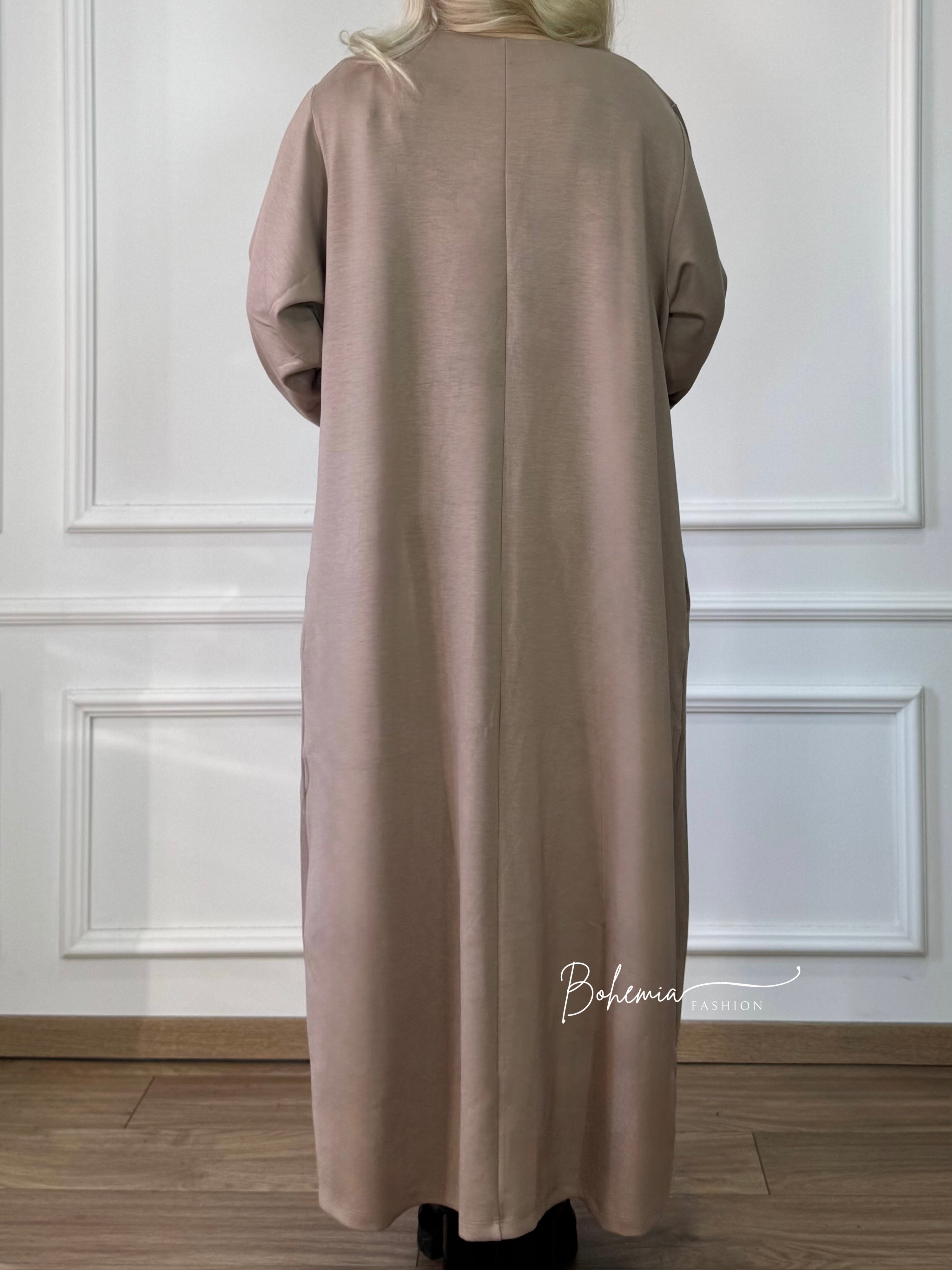 Această rochie din viscoză cu mânecă lungă combină stilul simplu cu confortul. În față, trei nasturi din lemn îi conferă un aspect special, iar materialul său moale și cu o cădere mai grea oferă o mișcare elegantă purtătoarei. Cele două buzunare laterale fac acest articol și mai practic.